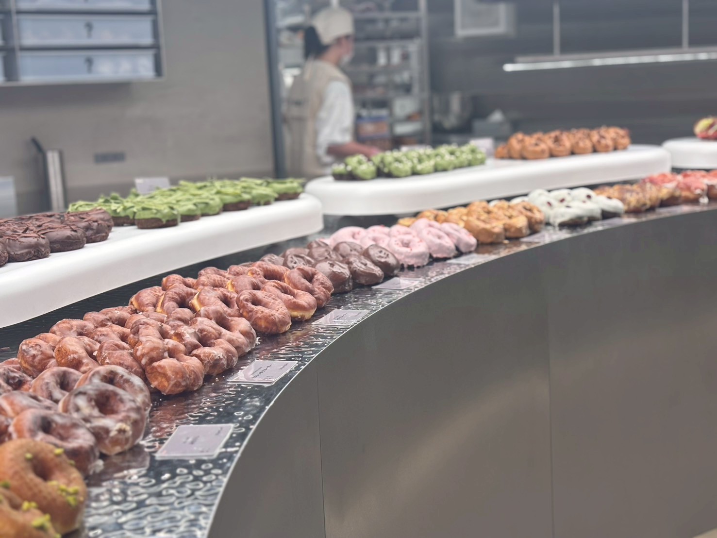 店舗内観。柱をぐるりと囲むように並ぶたくさんのドーナツ