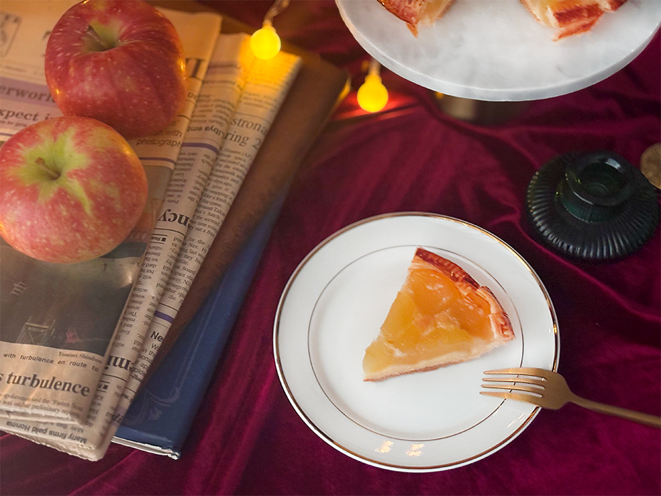 シャキッとした食感を残しつつ、ほどよく煮込んだりんごの自然な甘みと酸味が絶妙に調和し、香ばしいパイ生地とカスタード、アーモンドクリームが重なることで、ひとくちごとに奥行きのある味わいを楽しめます。