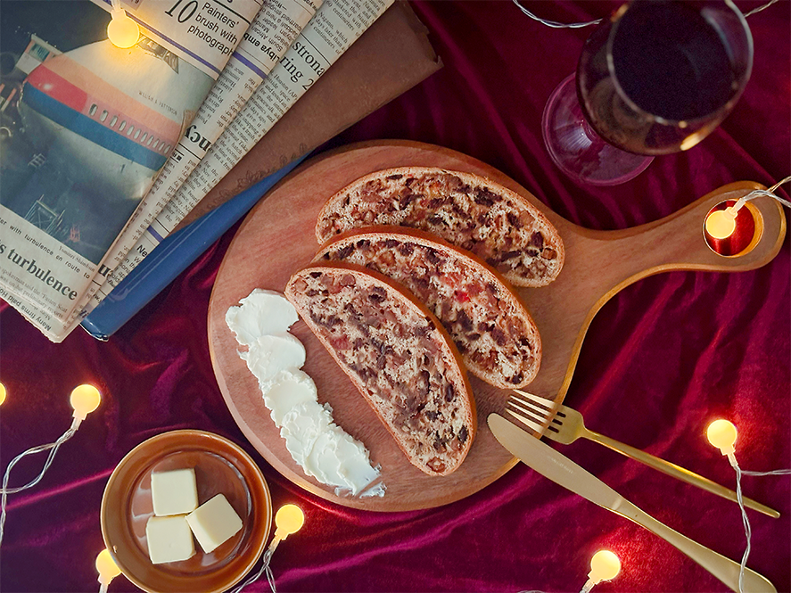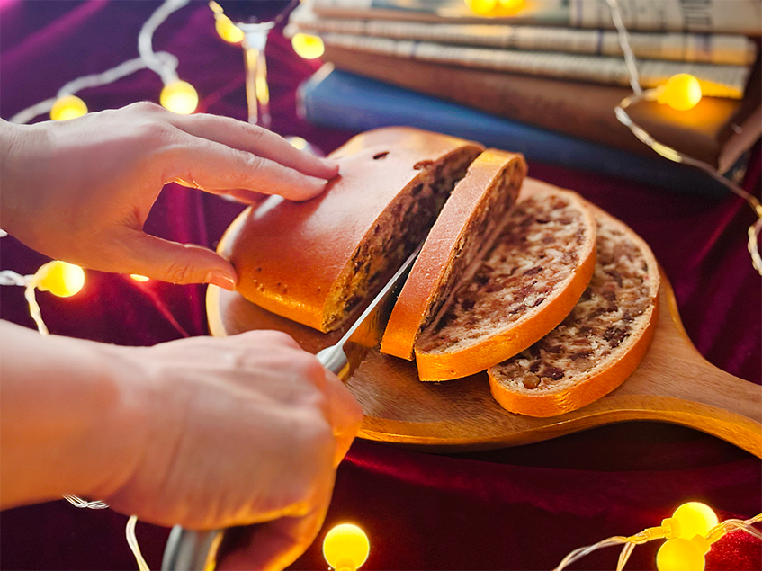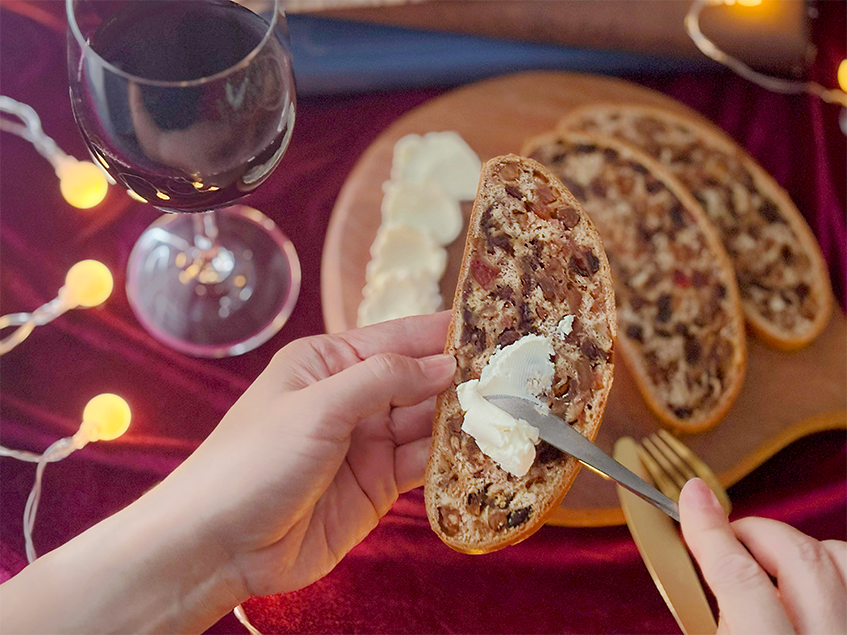 しっとりとした生地に豊かなフルーツの香り、シナモンのやわらかな風味が重なり合い、クリスマスの食卓やワインともよく合います。