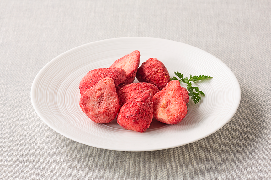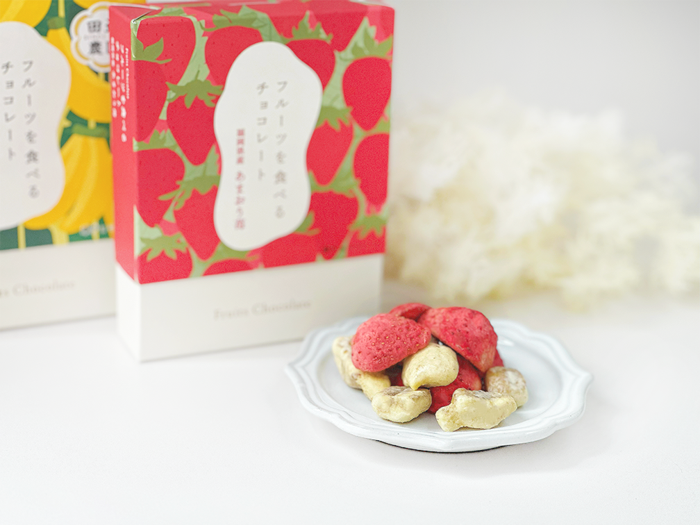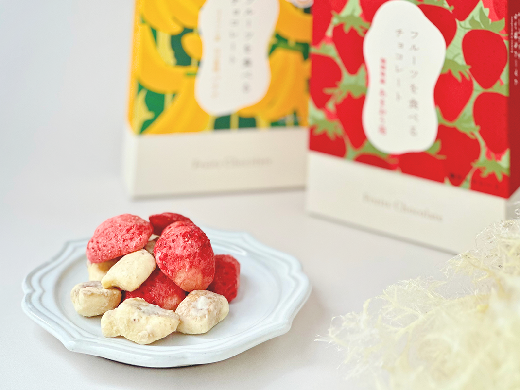 いちごやバナナなど、産地にこだわって選んだフルーツを丁寧にフリーズドライし、そこに特殊な技術でホワイトチョコレートを“浸み込ませ”るという「フルーツを食べるチョコレート」。