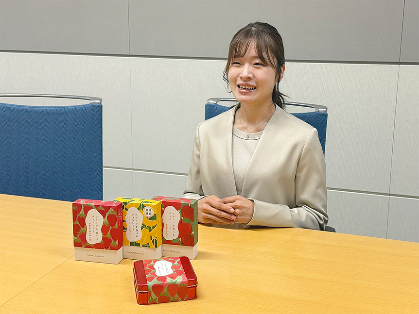 「食感がとてもおもしろいですよね。フルーツの外側にチョコレートをかけるのではなく、フリーズドライにしたフルーツの中にチョコレートを“浸み込ませて”いるので、このような口あたりになるんです」