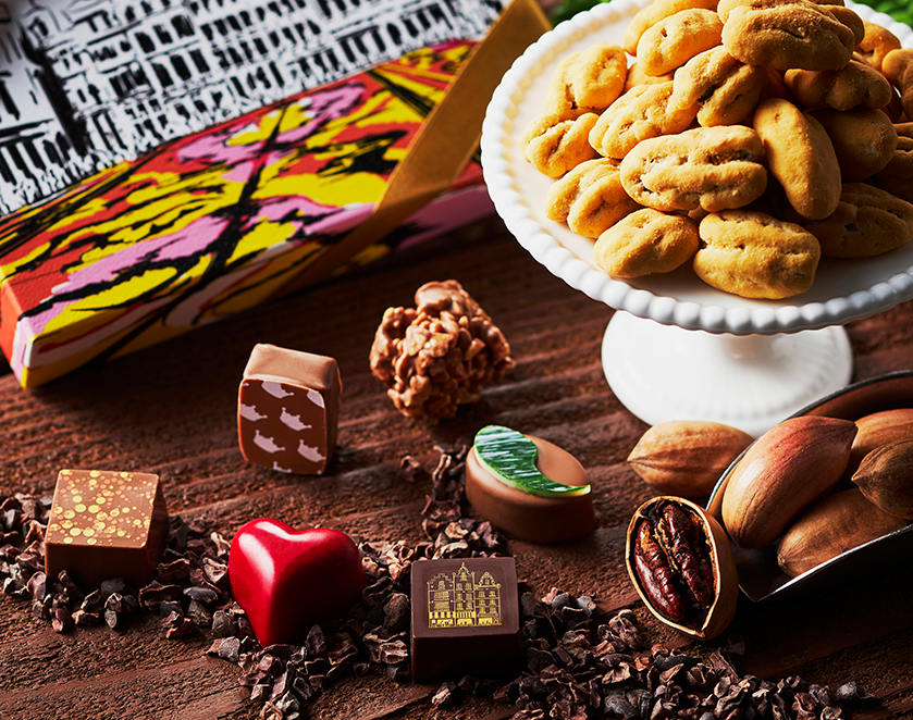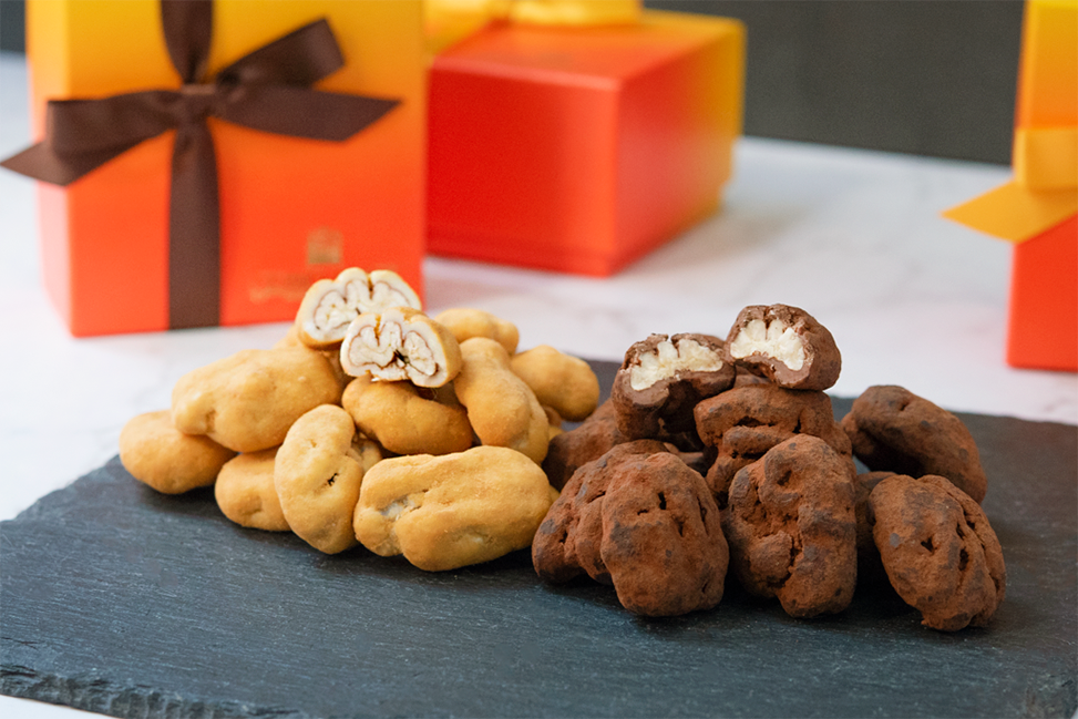 香ばしくローストされた大粒のペカンナッツを、オリジナルクーベルチュールで包み込み、仕上げにフレーバーパウダーをたっぷりと纏わせた「ペカンナッツショコラ」は、ひとくち含めば、そのまろやかな甘みと香ばしさに誰もが納得する仕上がりです。