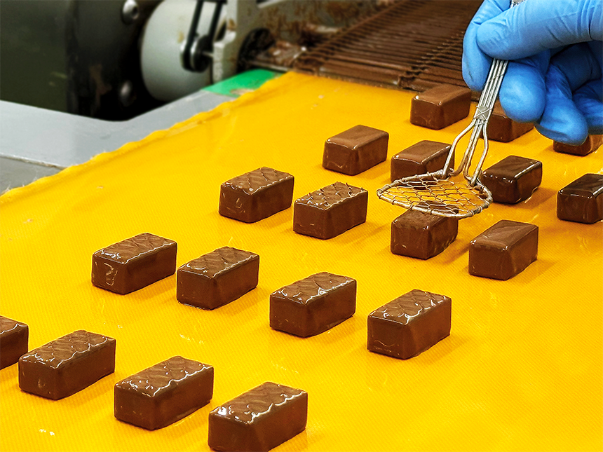チョコレートの層の厚みは、数字ではなく職人の“目”と“勘”で決まります