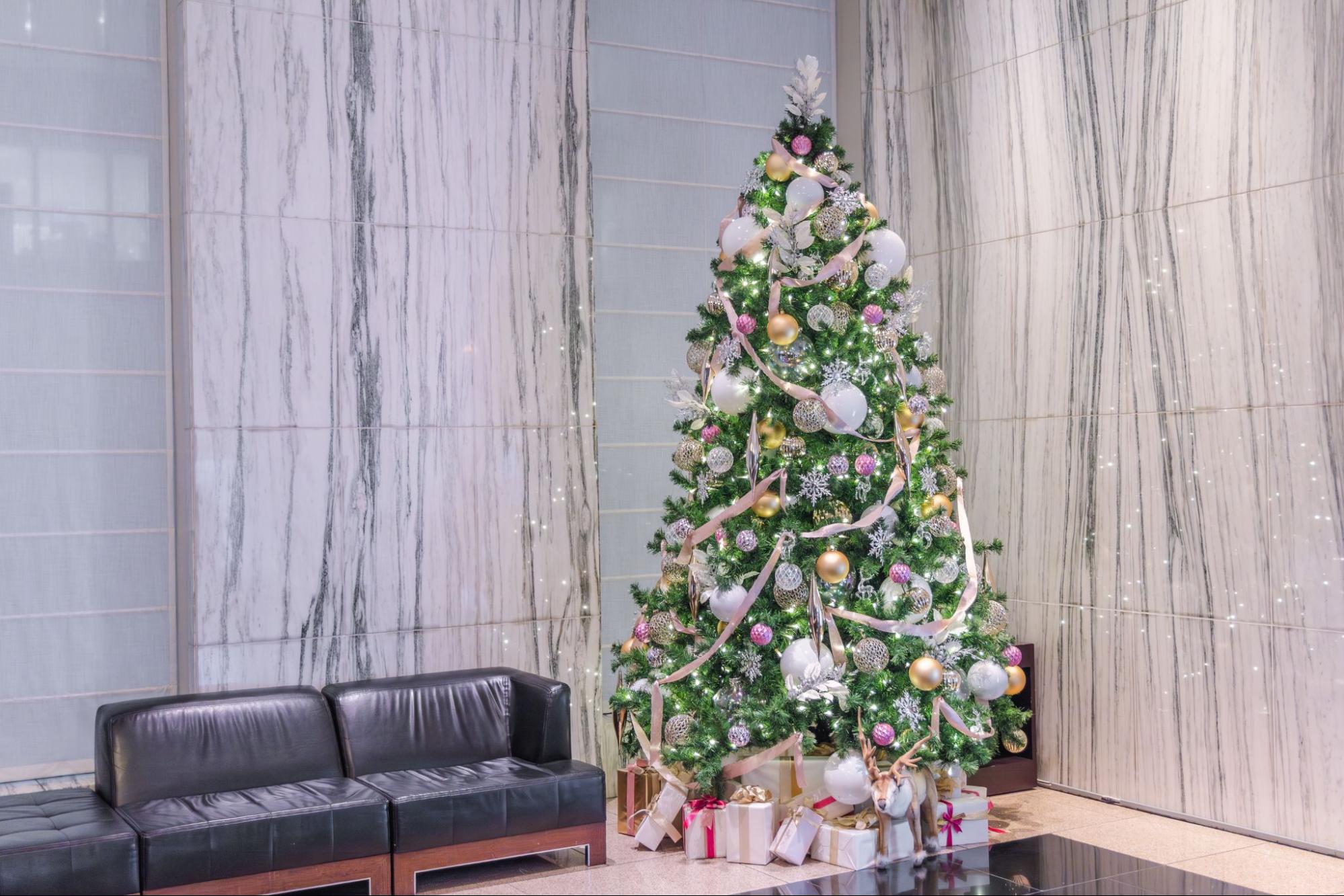 ロビーからはクリスマスムードが漂い、パールホワイトとピンクの装飾がきらめきます。どこかやさしい空気に包まれて、自然と心が躍るよう。