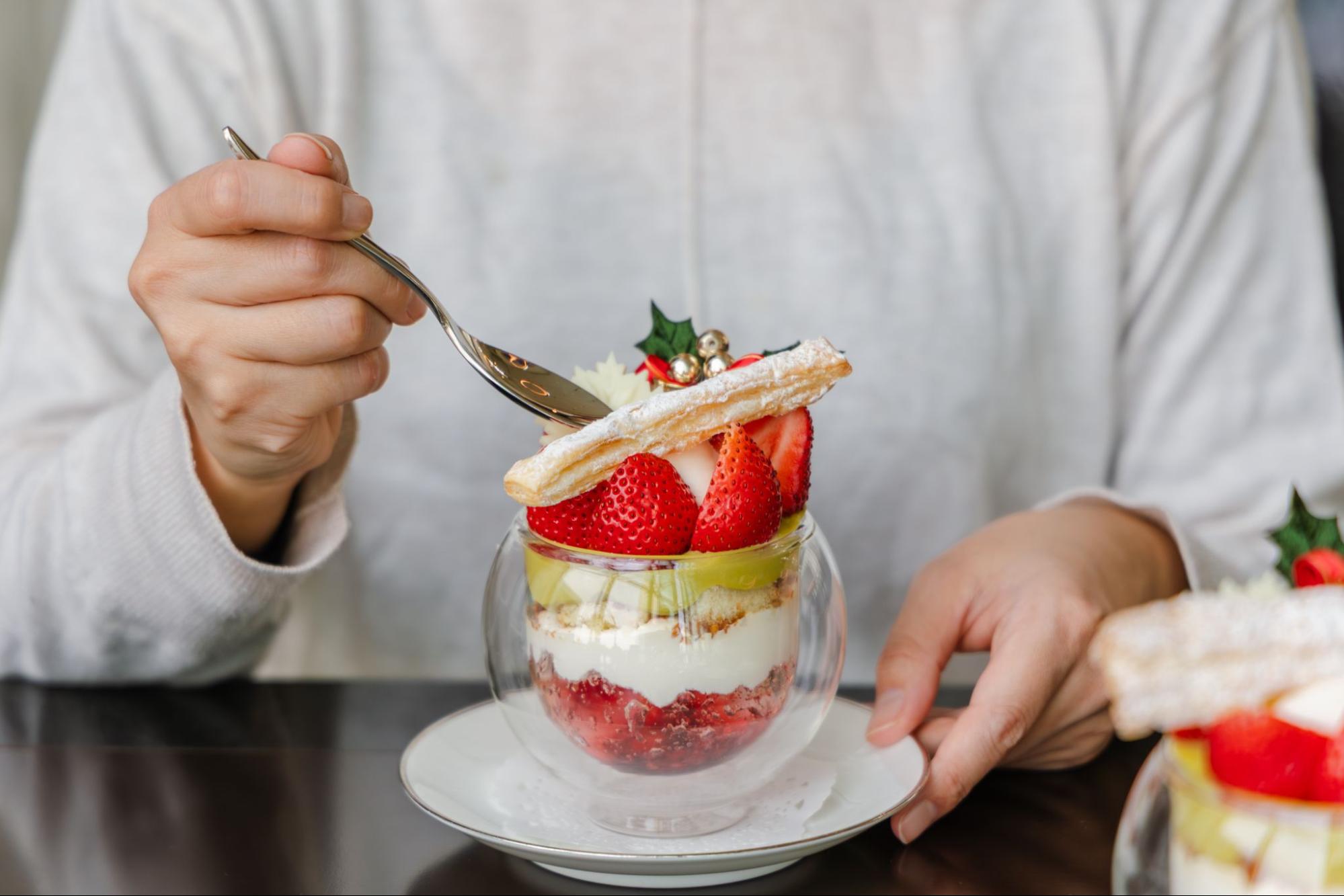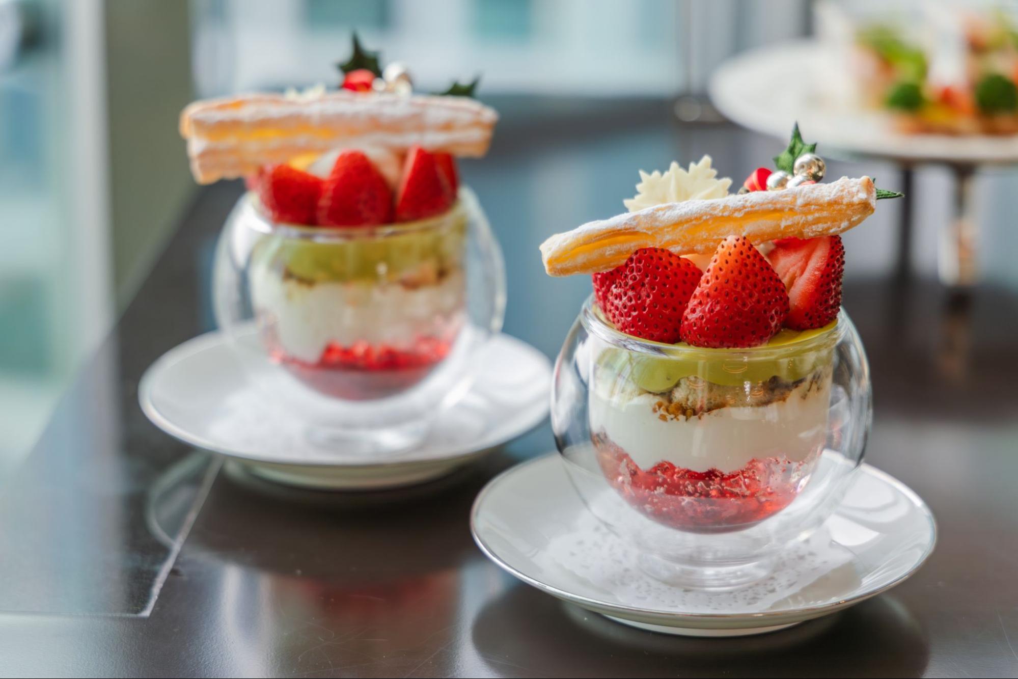 グラスの中には9種類の味が重なり、深紅のストロベリーやフランボワーズソースの鮮やかさ、そしてもみの木を思わせるピスタチオカスタードの緑が、クリスマスカラーで華やかに彩ります。見ているだけで心が弾むような美しさです。