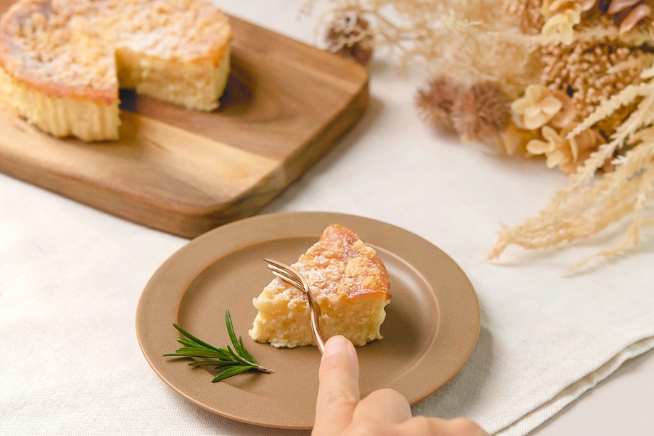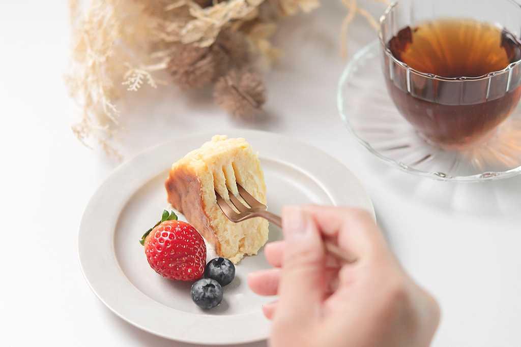 ほろ苦く香ばしい外側と、とろける内側の食感が魅力。添加物に頼らず、5つの素材だけで作ったこだわりチーズケーキです。