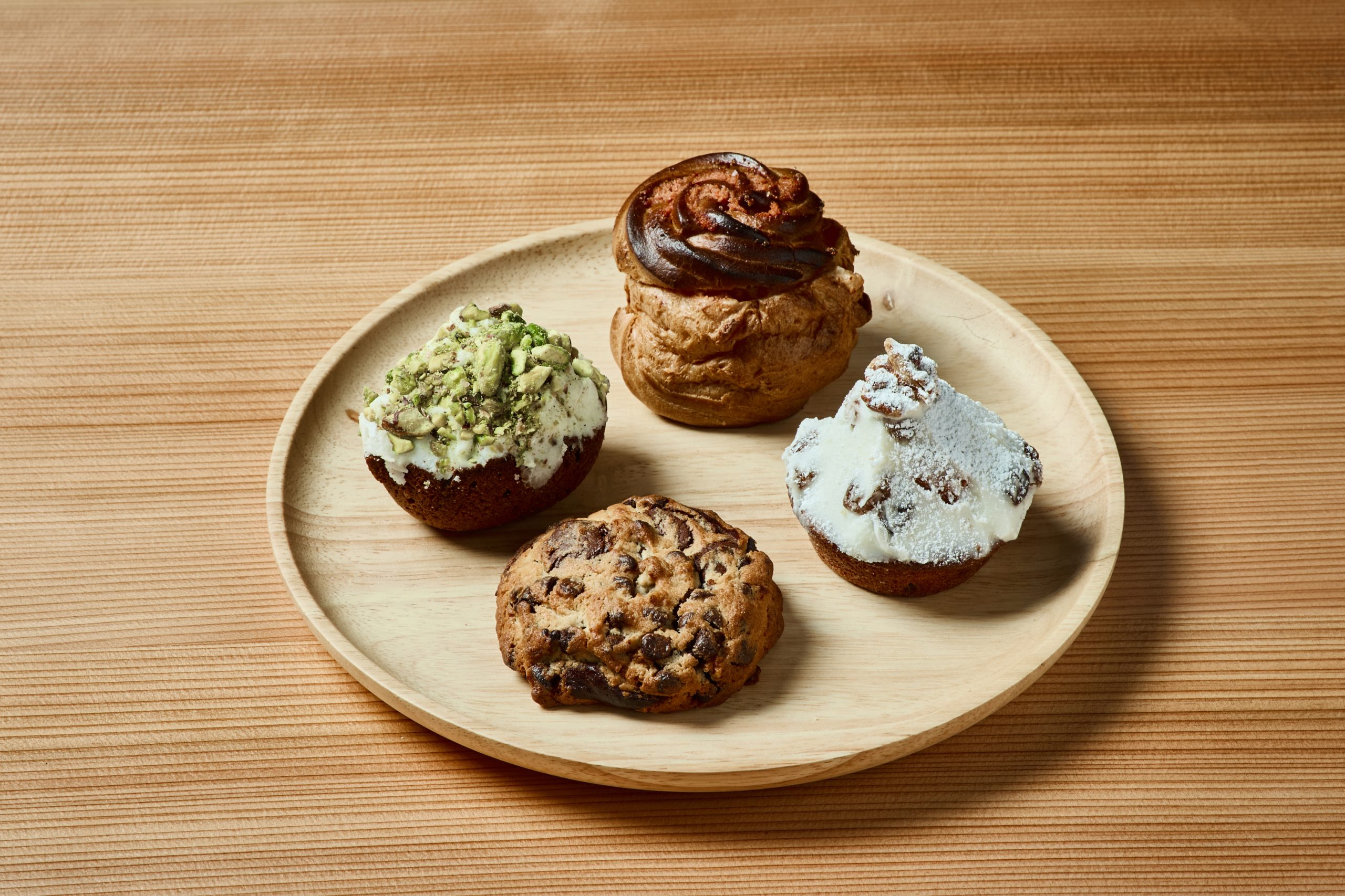 写真左から、リッチピスタチオケーキ・明太グラタンシュー・ラムレーズンケーキ・チョコレートジャンキークッキー