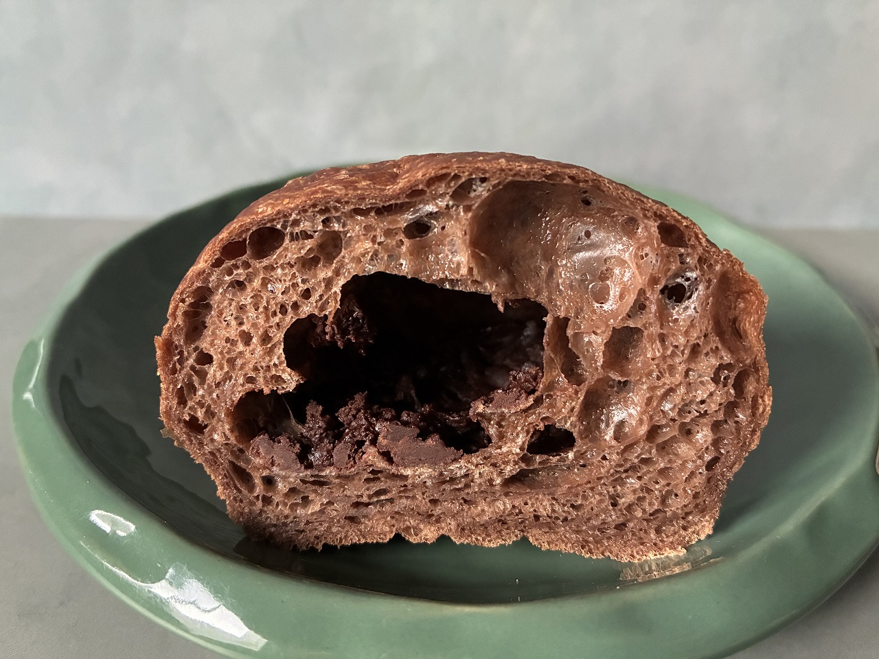 生地にはココアが練り込まれているため、全体の甘さは控えめ。チョコレートのコクを引き立てつつ、最後まで重たくならずに食べ進められるのも魅力です。甘いパンが得意でない人にもすすめたくなるひと品。