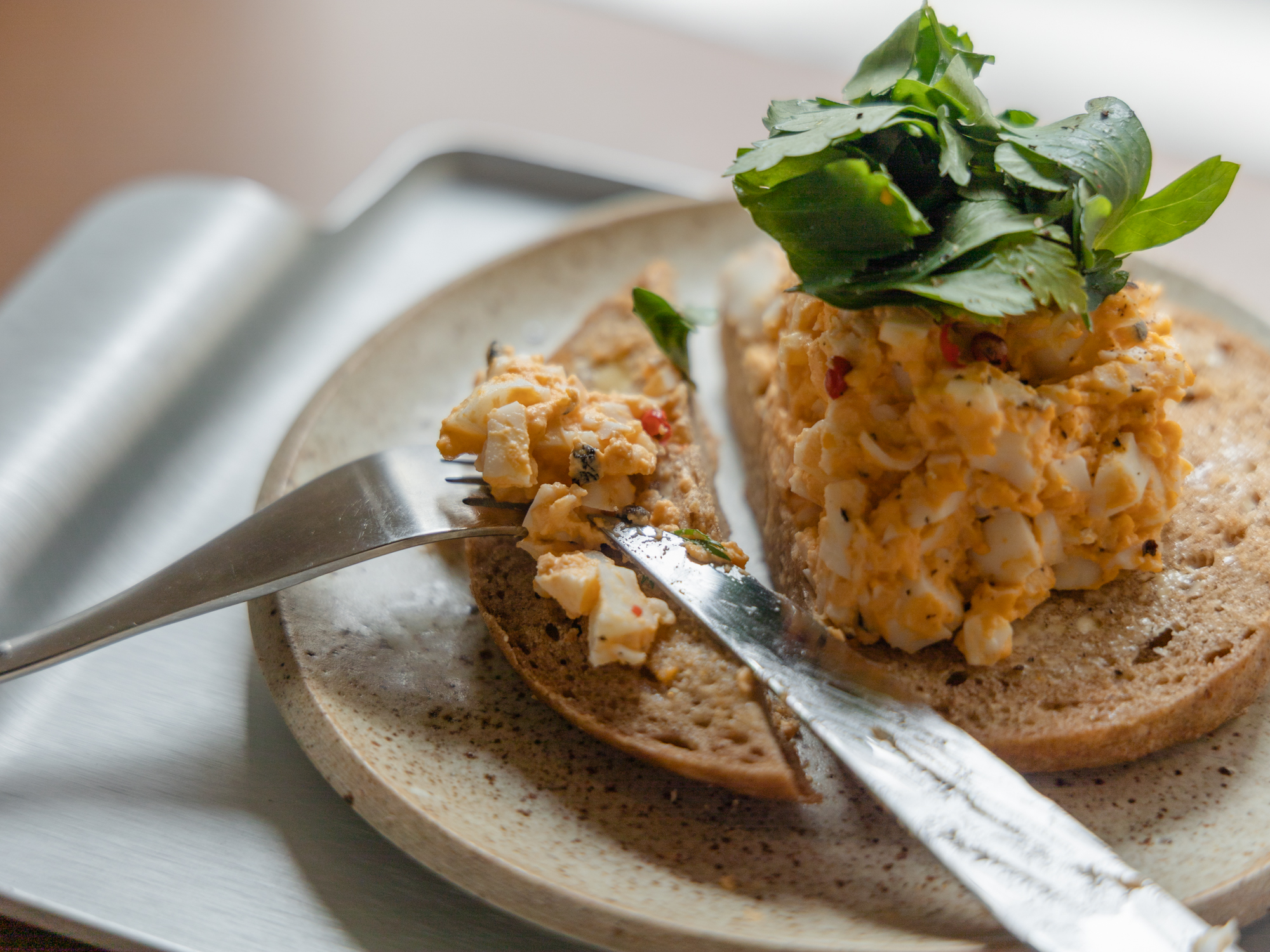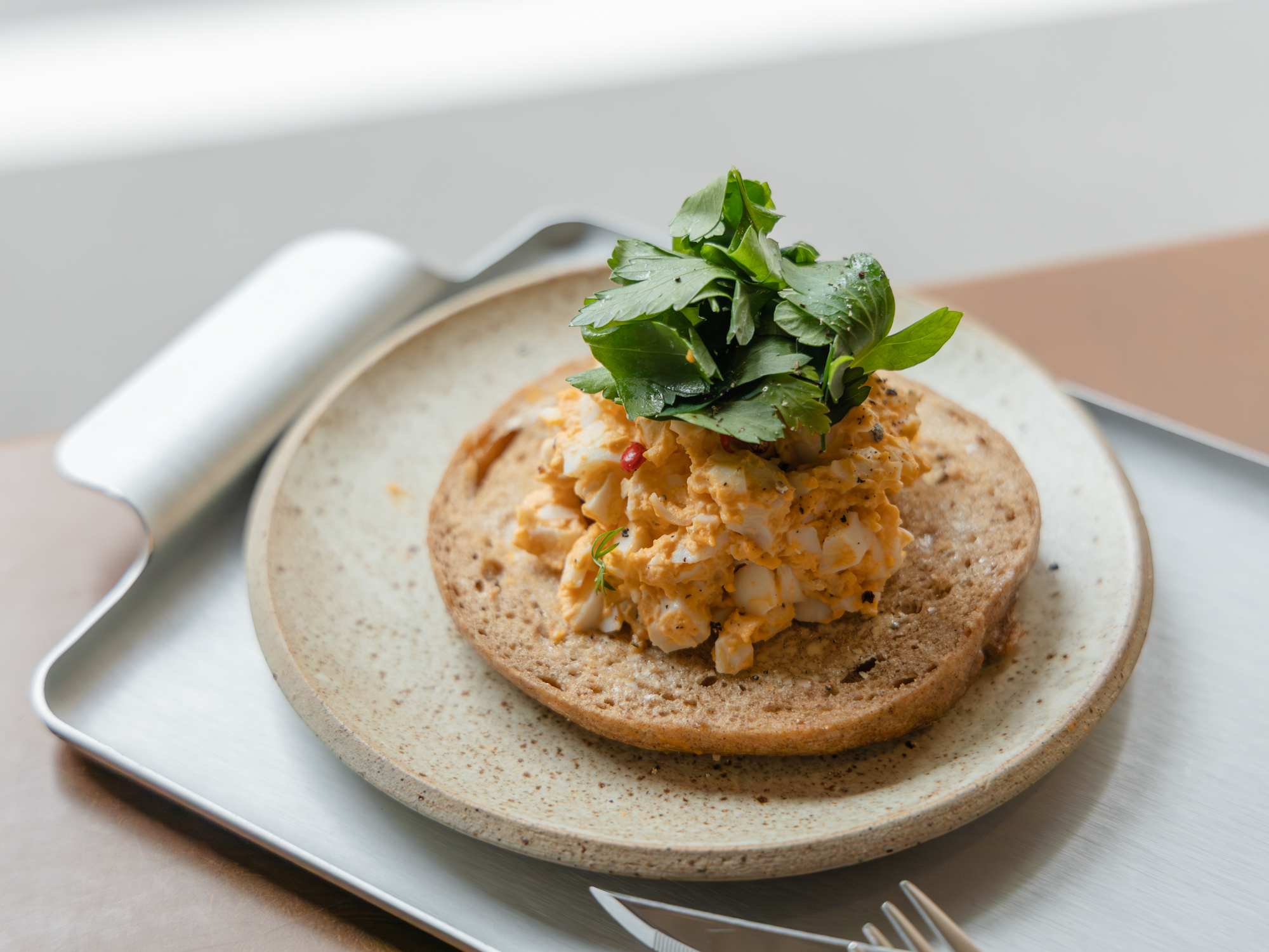 荒く刻まれた卵サラダには、ピンクペッパー、ディル、イタリアンパセリが添えられ、香りのアクセントに。そこにトリュフの香りが重なり、食欲をそっと刺激してくれます。主張しすぎることなく、全体がやさしくまとまった味わいで、最後までバランスよく楽しめました。