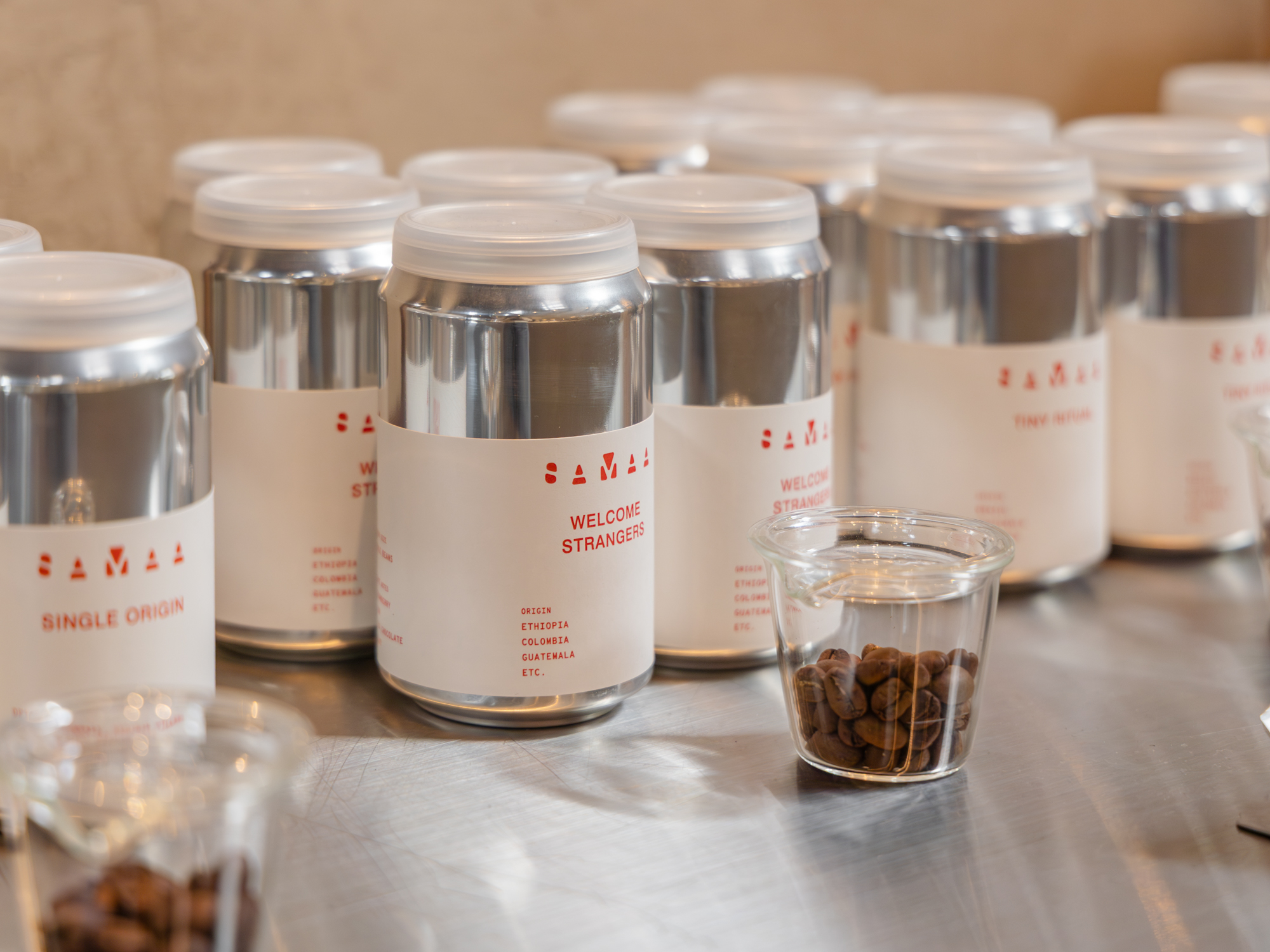 店内の一角には、「SAMAA_」の世界観を映したオリジナルグッズやコーヒー豆が並びます。ロゴを配したタンブラーやキャップ、手に取りやすいサイズ感のアイテムは、主張しすぎず、日常に自然となじむデザイン。