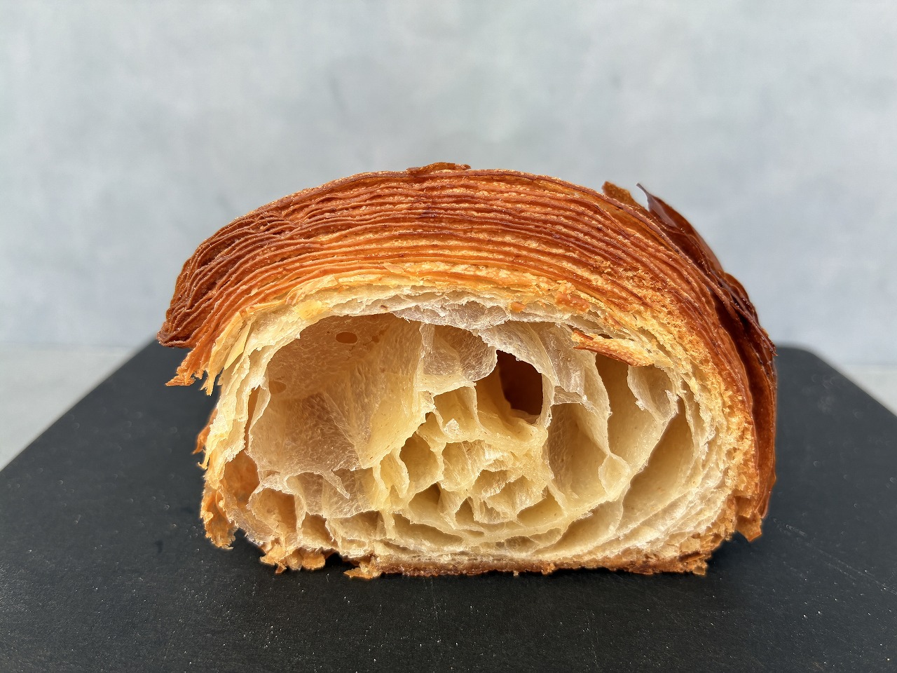 ニシノカオリを使用した生地にルバン種を加え、北海道産発酵バターと奄美諸島産の素焚糖を使用したクロワッサン。ガリッ、ザクッとした歯切れのよさが心地よく、全体はエアリーで軽やかな口あたり。それでいてクラムはしっとりとした質感を保っています。