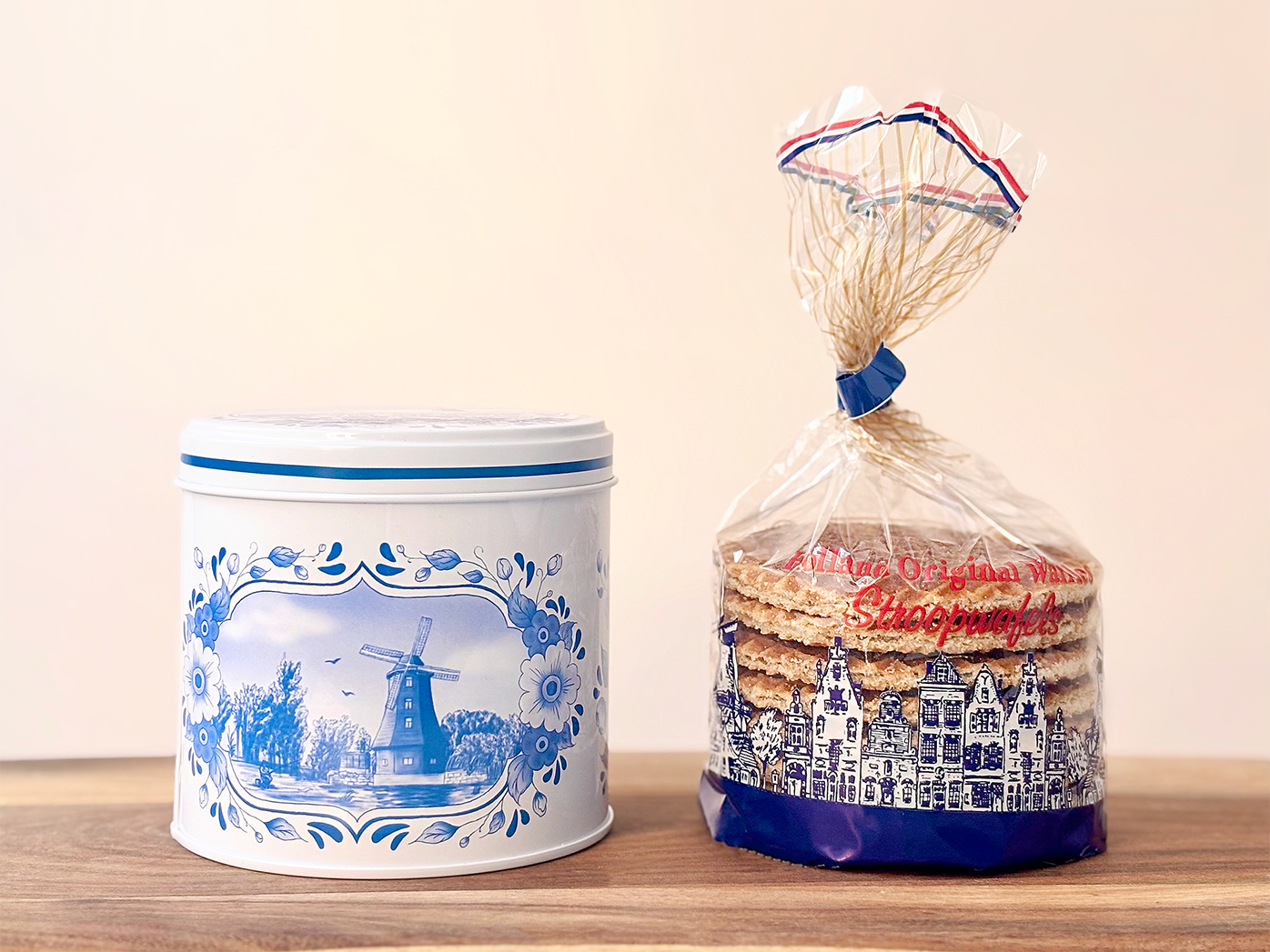 缶入りタイプの「ホーランドワッフル ストループワッフル」は、青と白を基調とした「デルフト焼き」を思わせるデザインも印象的。