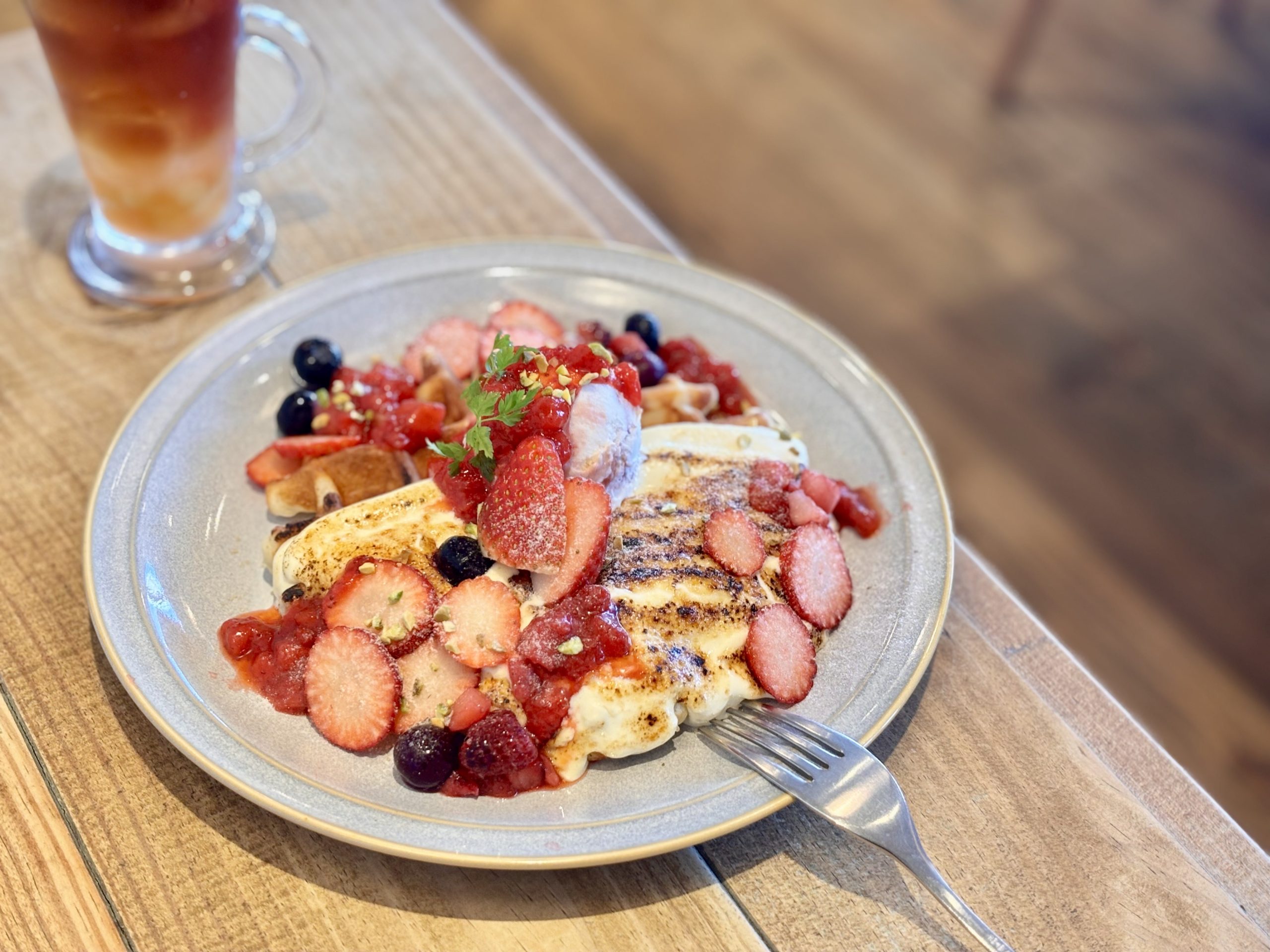 いちごの瑞々しさ、ブリュレの香ばしさ、ワッフルの食感が三位一体となったひと皿は、「いちごフェア」を象徴する完成度の高いスイーツ。写真映えと満足感、どちらも譲れない方におすすめです。