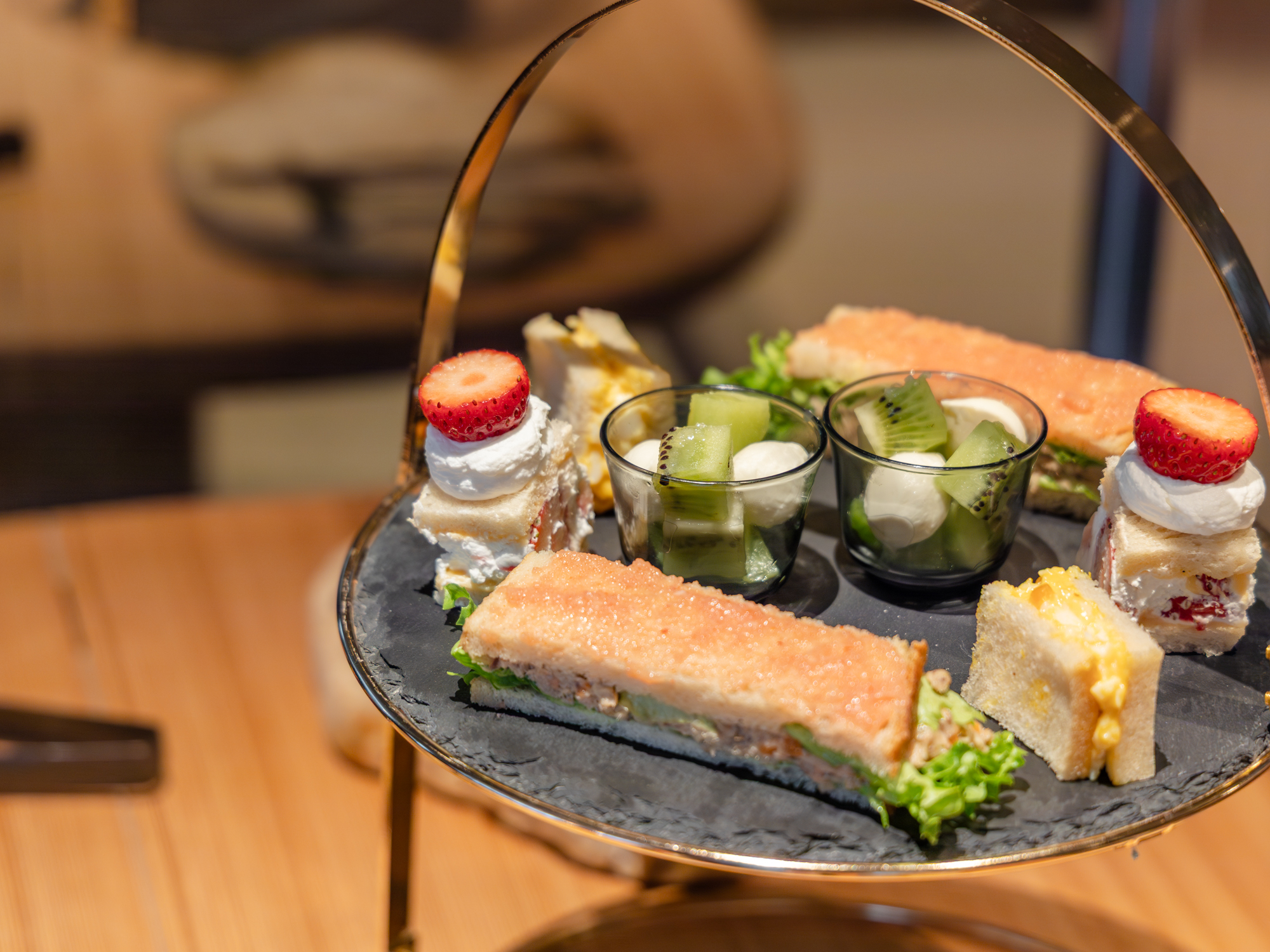上段には、たまごサンドや自家製ツナの明太子サンド、フルーツブレッドショートケーキなど、甘いものと塩味のバランスが楽しめる全4種類が並びます。
