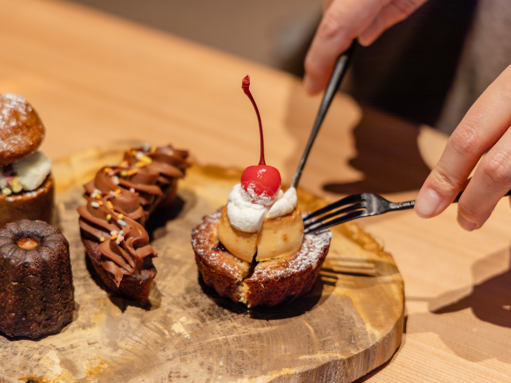 左:キャロットケーキ/右:左からチョコバナナフィナンシェ、キャロットケーキ、カヌレ