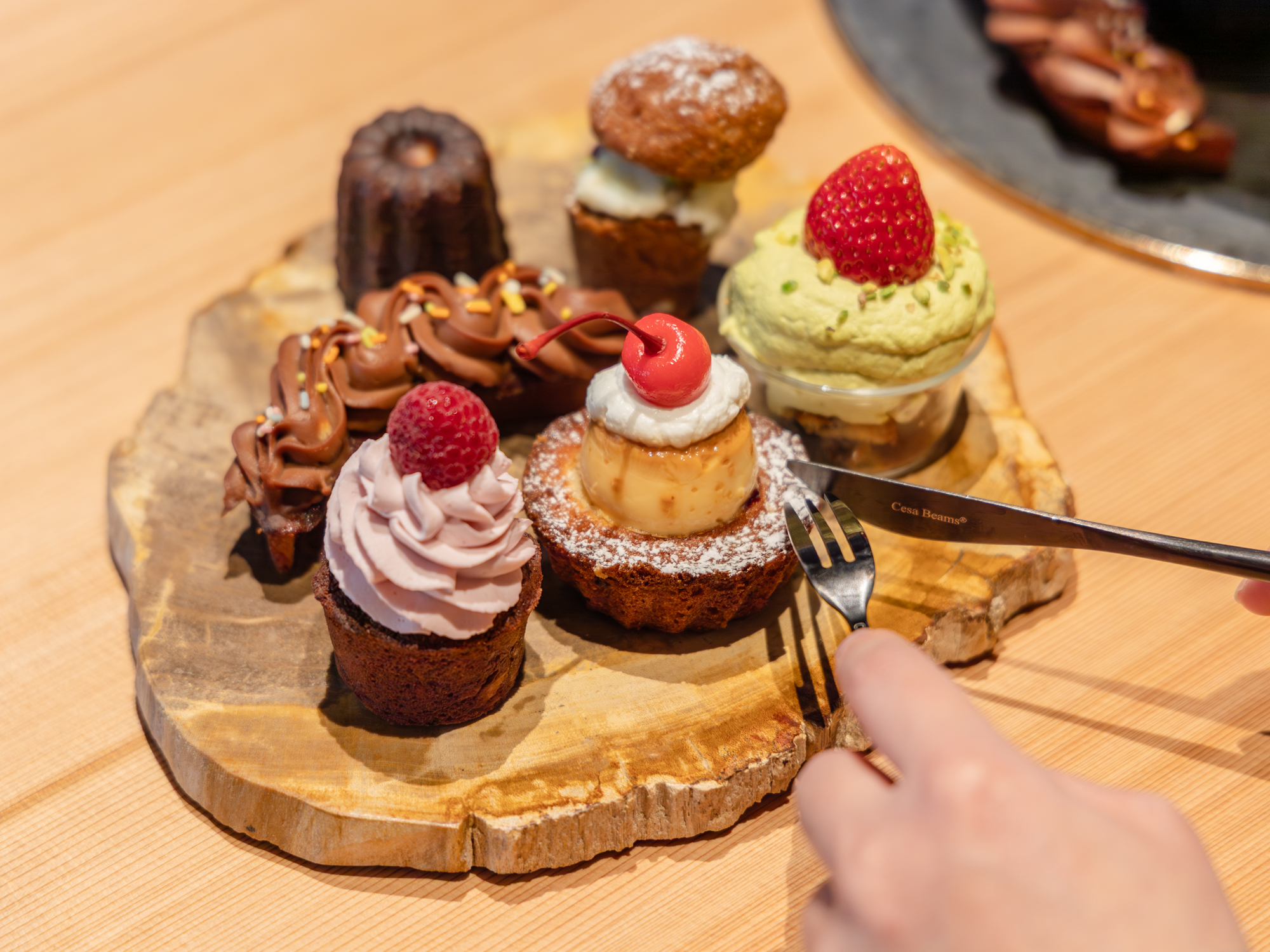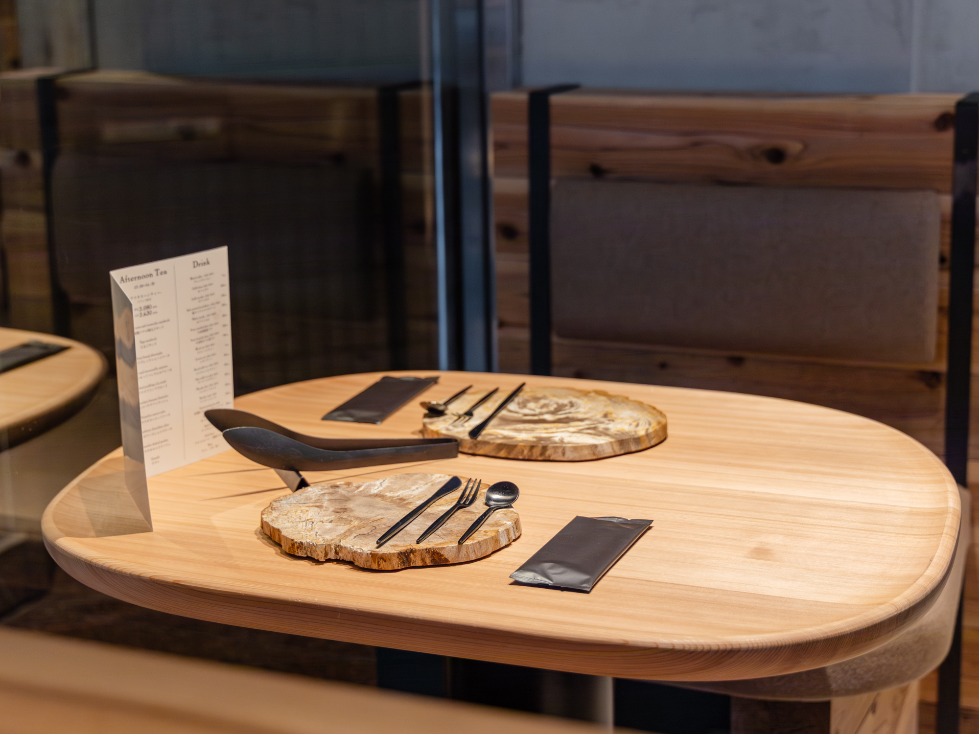 木工職人がひとつひとつ仕上げた杉材のテーブルは、質感もやさしく、アフタヌーンティースタンドを置いたときの佇まいも美しい印象。