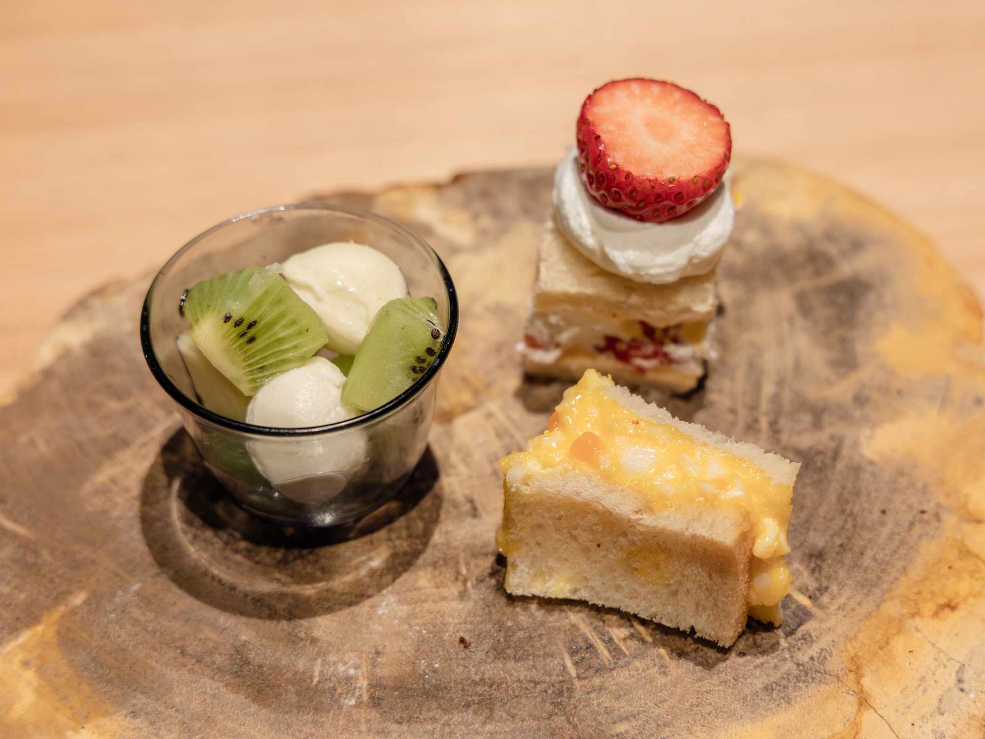 左からキウイとモッツァレラのカプレーゼ、フルーツブレッドショートケーキ、たまごサンド