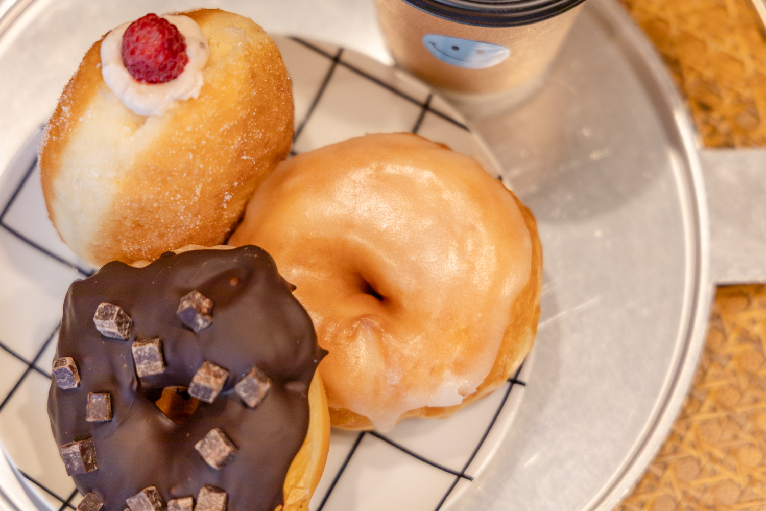 奥から時計回りに:フランボワーズホイップドーナツ、フィグハニークリームチーズドーナツ、ダブルチョコレートドーナツ