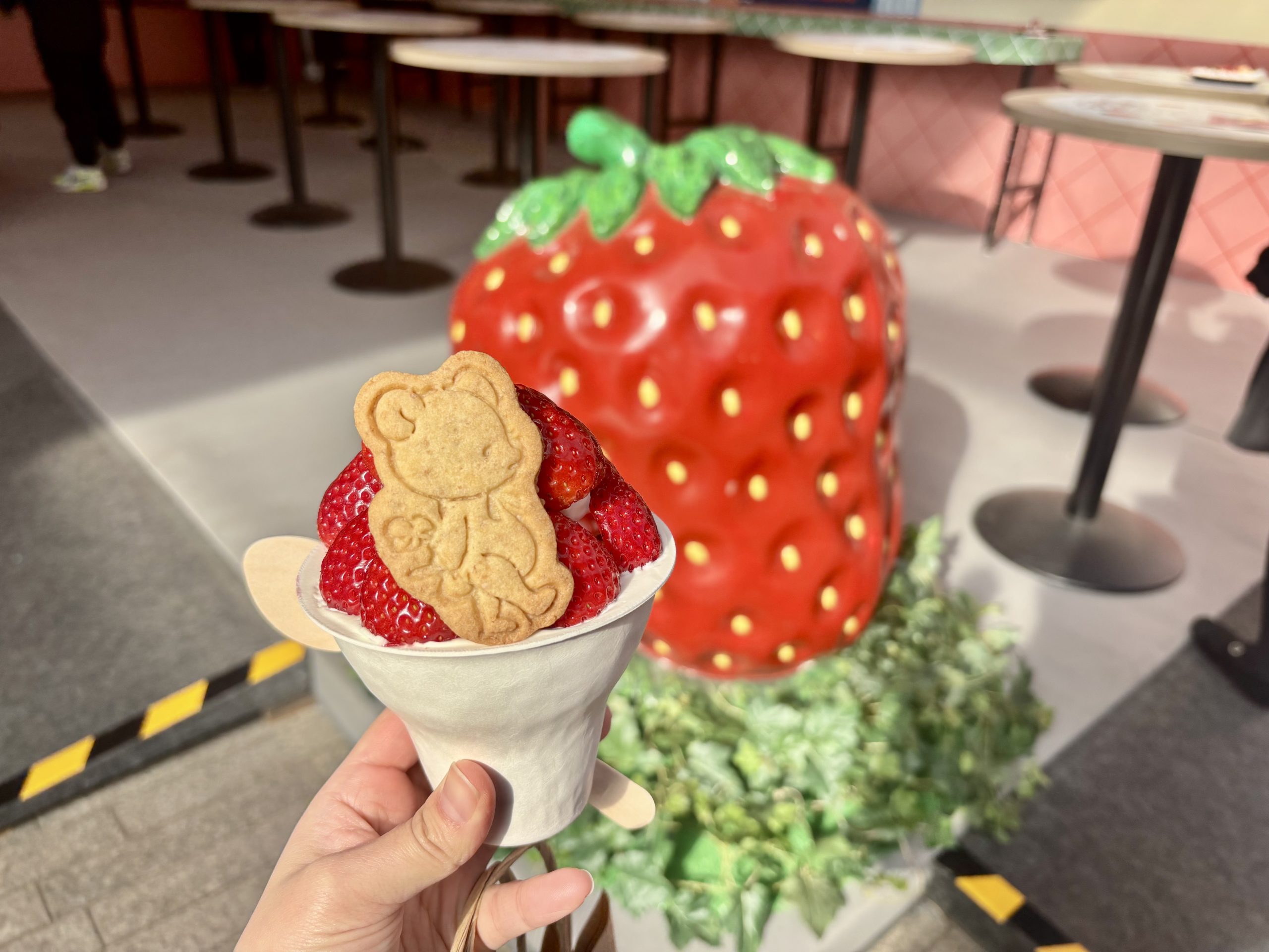 ひと口ごとに広がる、いちごの香りとコク。“これぞいちごフェス”と頷きたくなる味わい!無料エリア内で楽しめるのも、嬉しいポイントです。