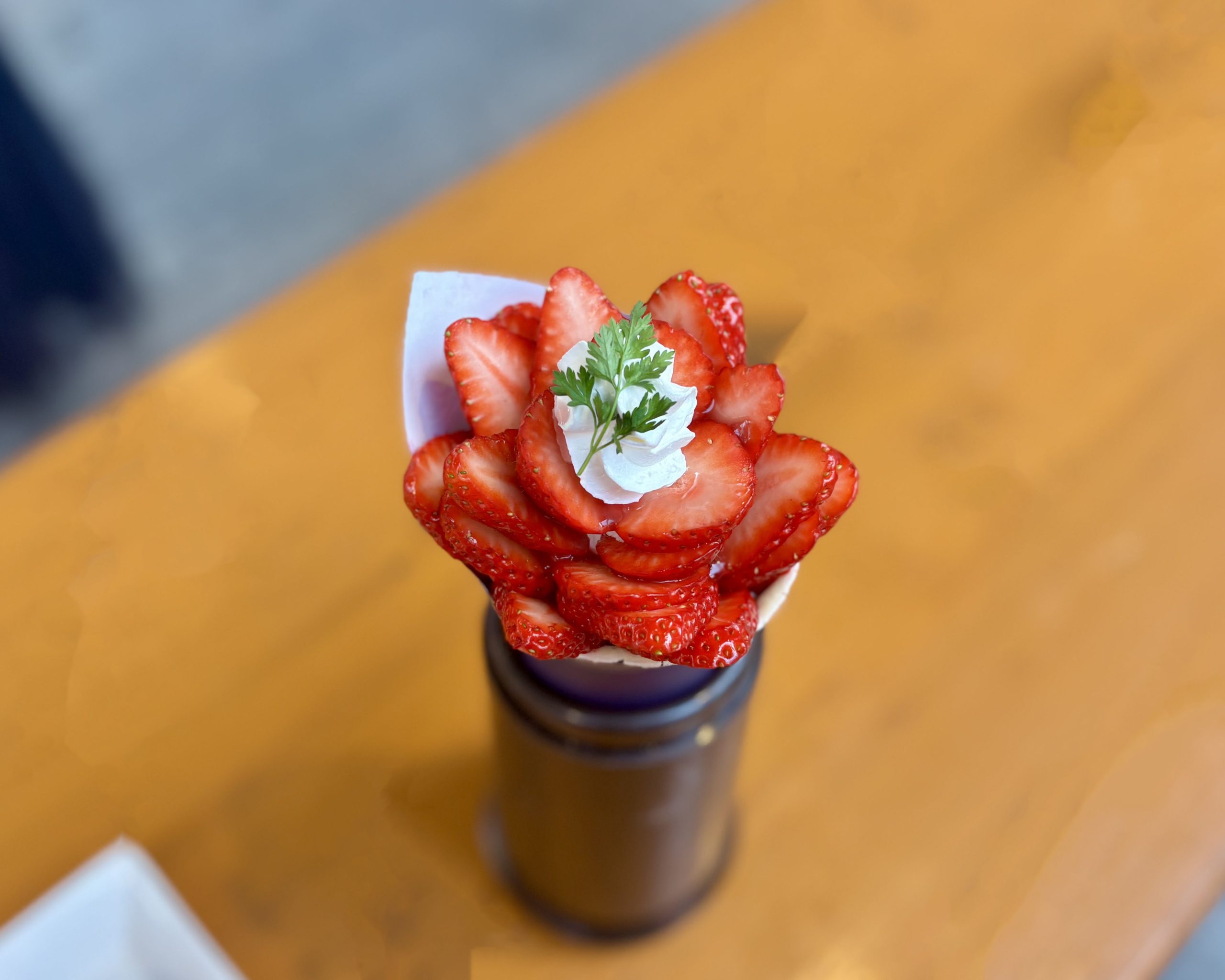 第1回全国いちご選手権で銀賞を受賞した佐藤果実工房の「よつぼし」をふんだんに使用した見た目も華やかなクレープ。