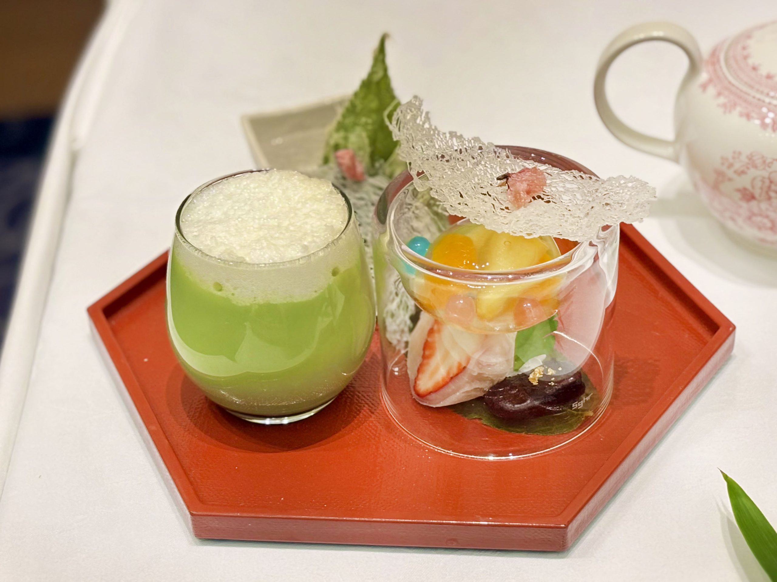 いちご大福のやわらかな甘み、塩漬けした桜の葉の天ぷらのほどよい塩味、もちもちの水まんじゅうに炭酸水を合わせることで、和風のフルーツポンチとして楽しめます。