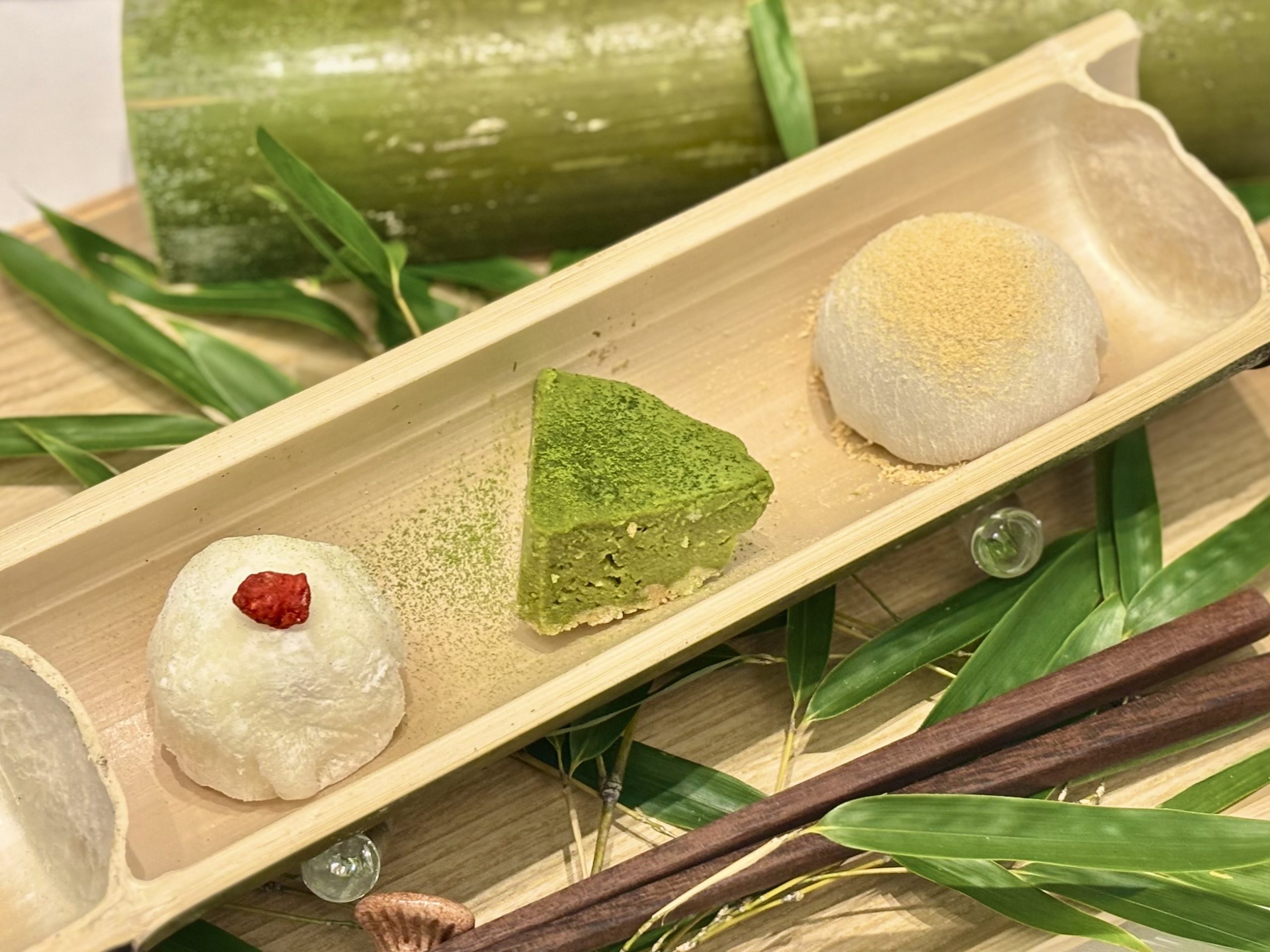 箱根産の竹の器に美しく盛り付けられたスイーツは、見た目にも印象的です。