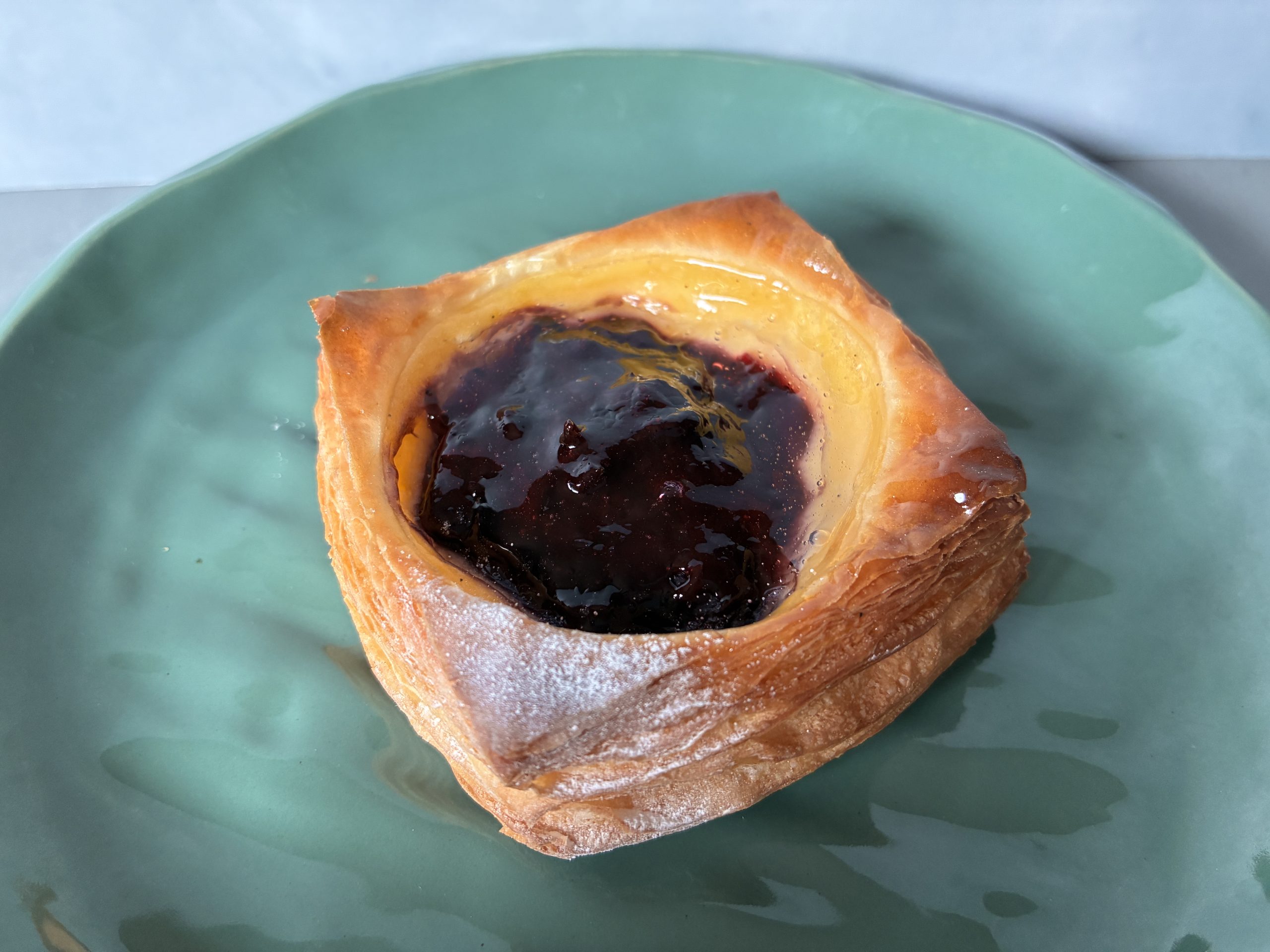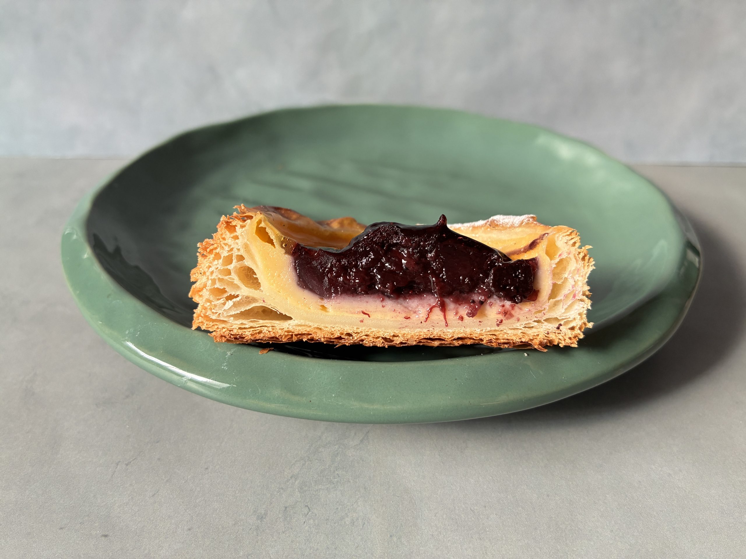 手のひらに収まる小ぶりなブルーベリーデニッシュ。土台となるのは、力強いザクザク食感のデニッシュ生地。その上にカスタードクリームと自家製ジャムが丁寧に重ねられています。