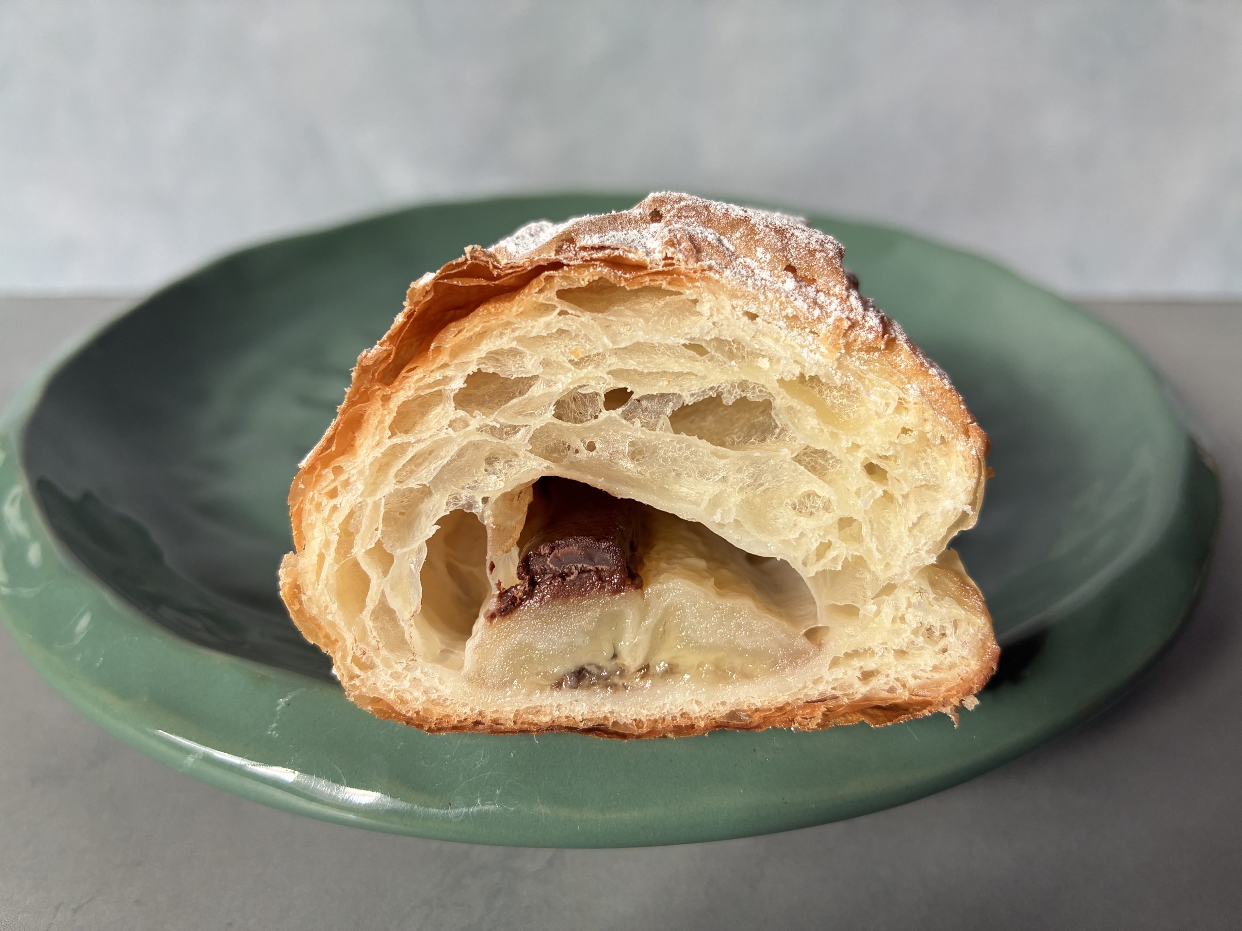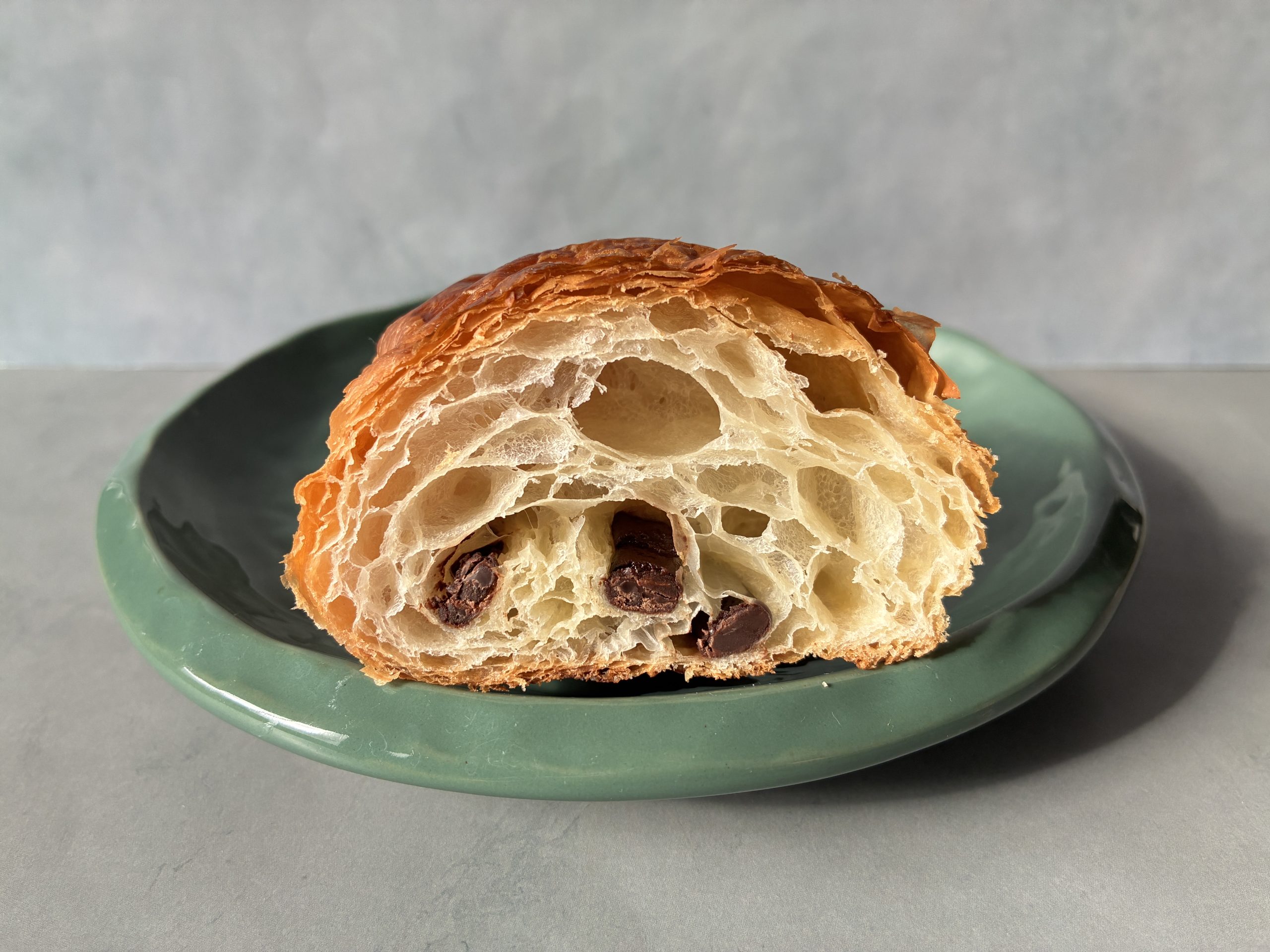 27層に折り重ねた生地で焼き上げたパン・オ・ショコラ。クロワッサンよりもやや薄くのばした生地は、ひと口目から軽やかな口あたりが広がります。中