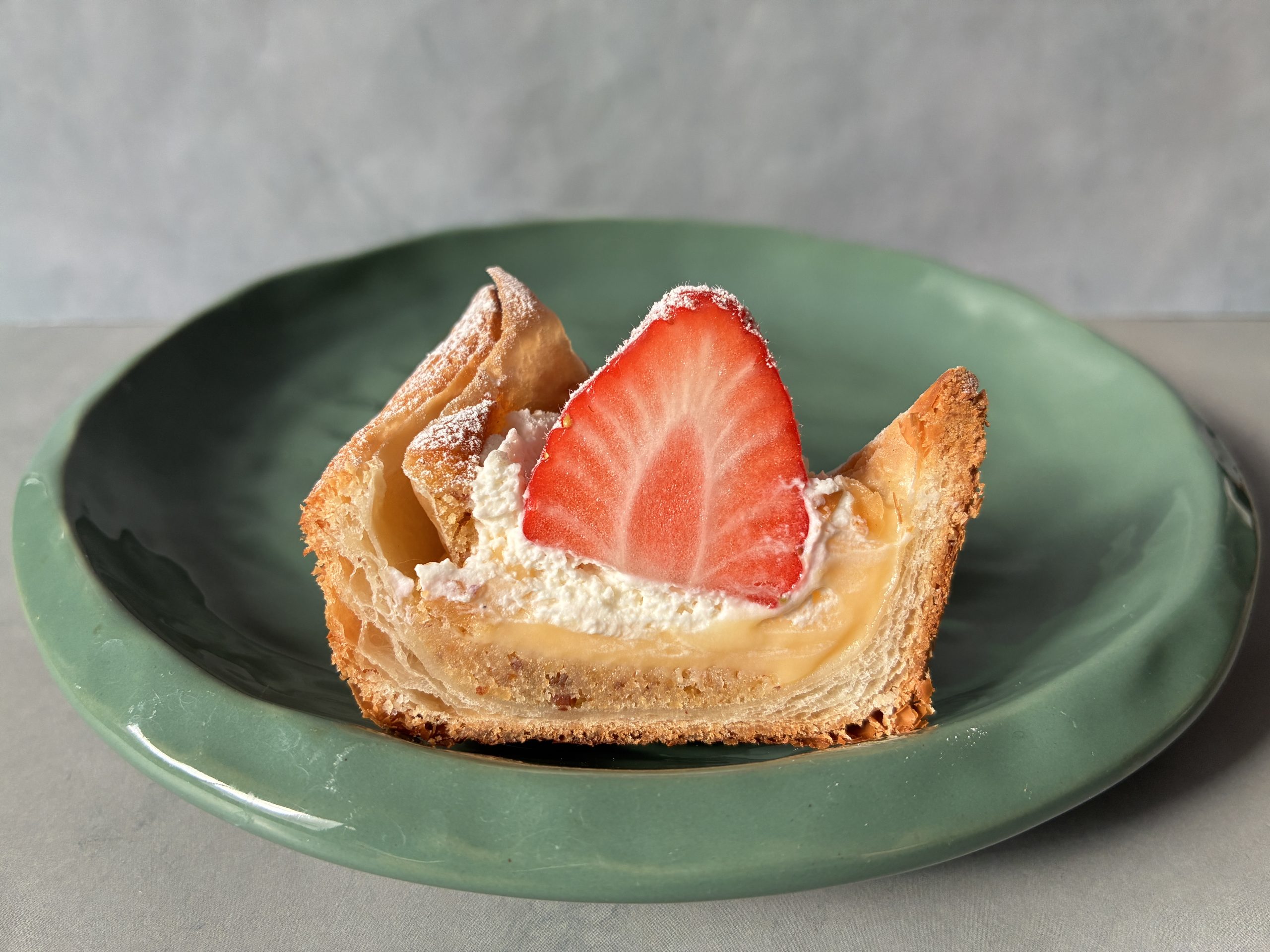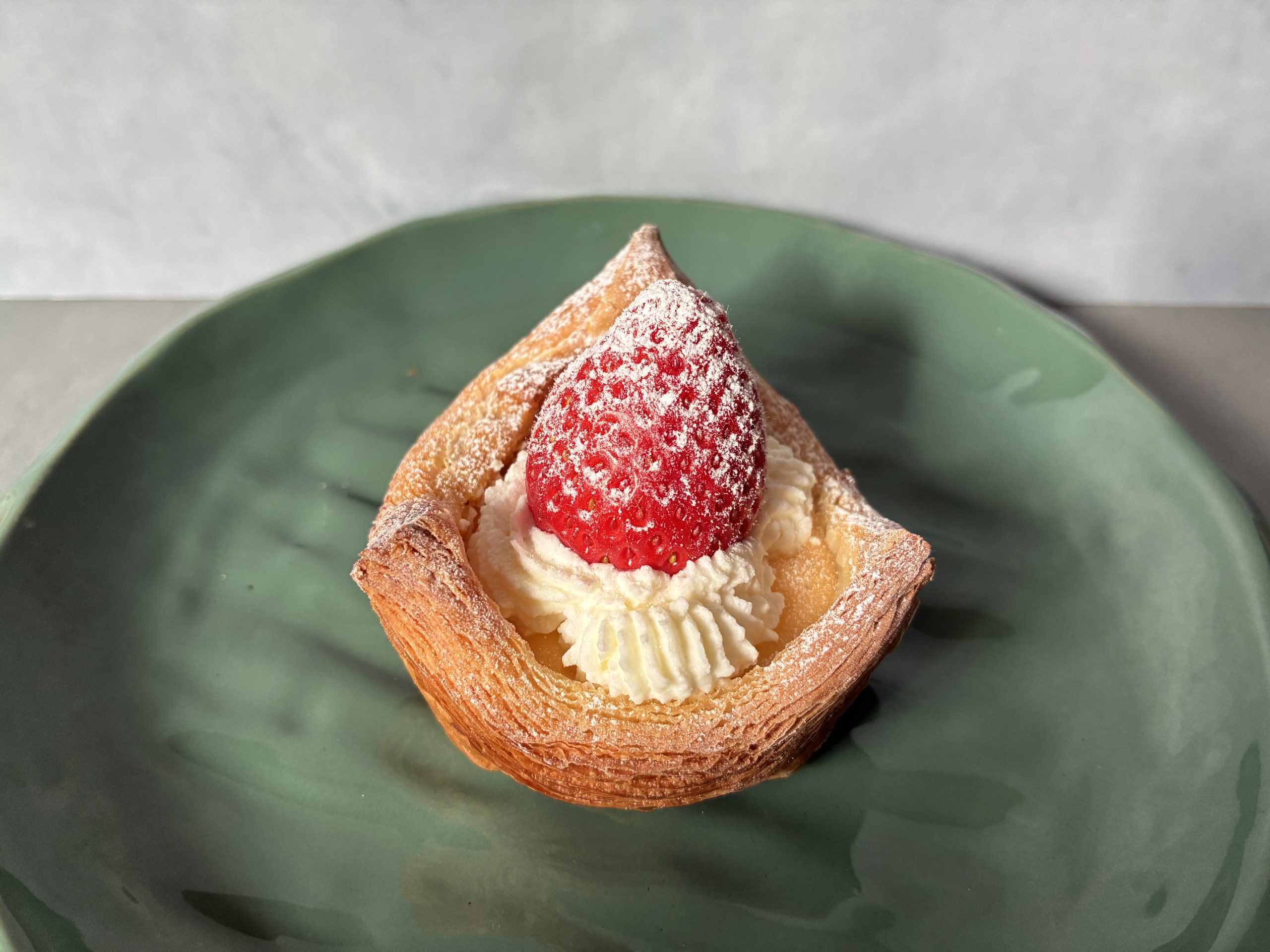 器のように縁を立ち上げた、愛らしいフォルムのいちごのデニッシュ。土台のデニッシュ生地にはダマンドを敷き、さらにフランスの伝統菓子「カトルカール(Quatre-quarts)」日本でいうパウンドケーキを粉末状にして混ぜ込み、焼き上げているのだそう。