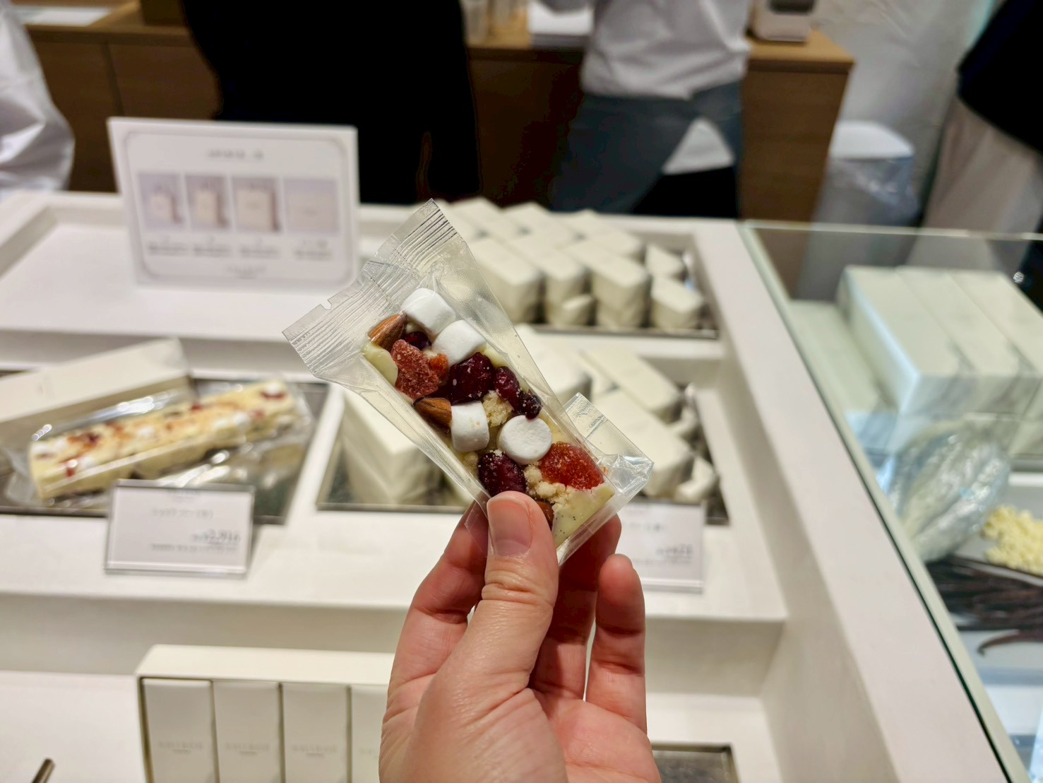 ホワイトチョコのやさしい甘さに、マシュマロやクランブルの食感、ローストアーモンドの香ばしさ、ドライフルーツのさわやかさな旨みが口のなかで広がります。