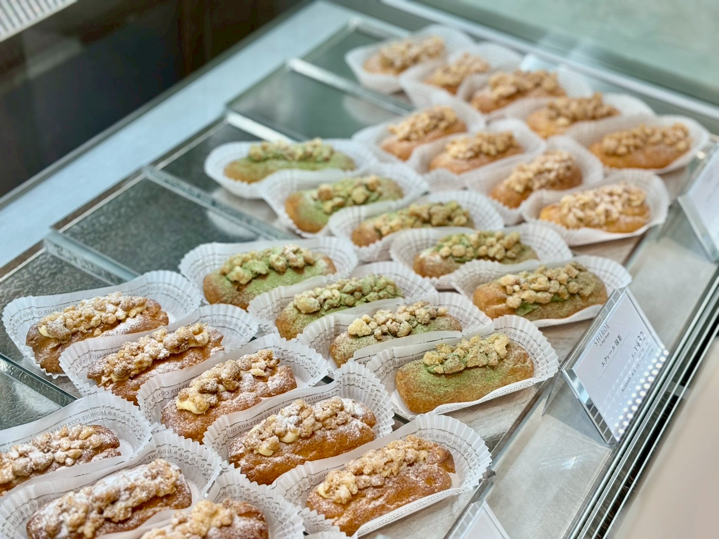 手頃なサイズ感のエクレール。しっとりと焼き上げたシュー生地に、サクサクとした食感が楽しいクランブルをトッピング。