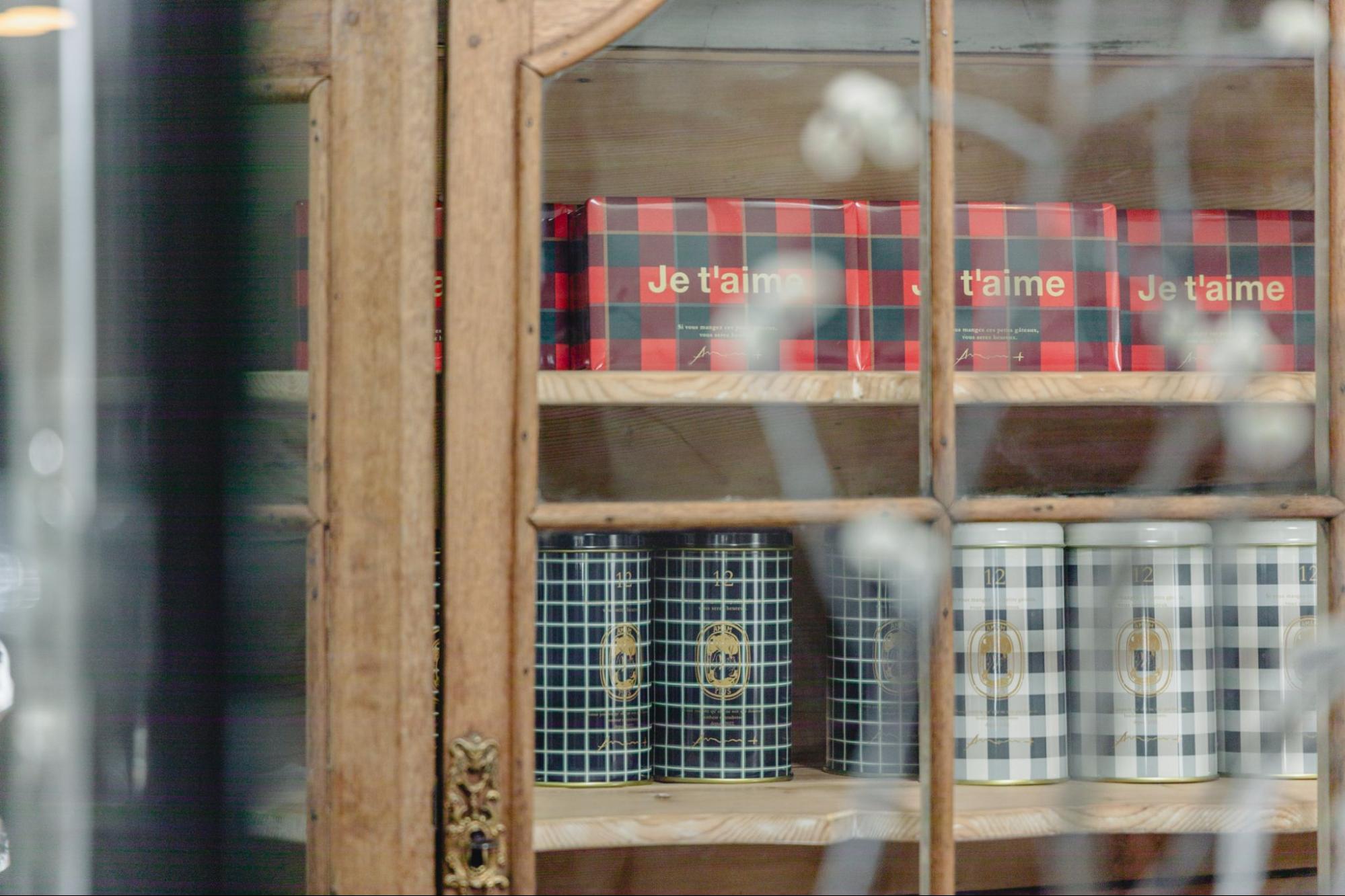 グレーのチェック柄に黒いリボンをあしらったクッキー缶「ビスキュイアマム」。その他にも数種類のクッキー缶があり、どれも思わず飾りたくなるかわいさです。