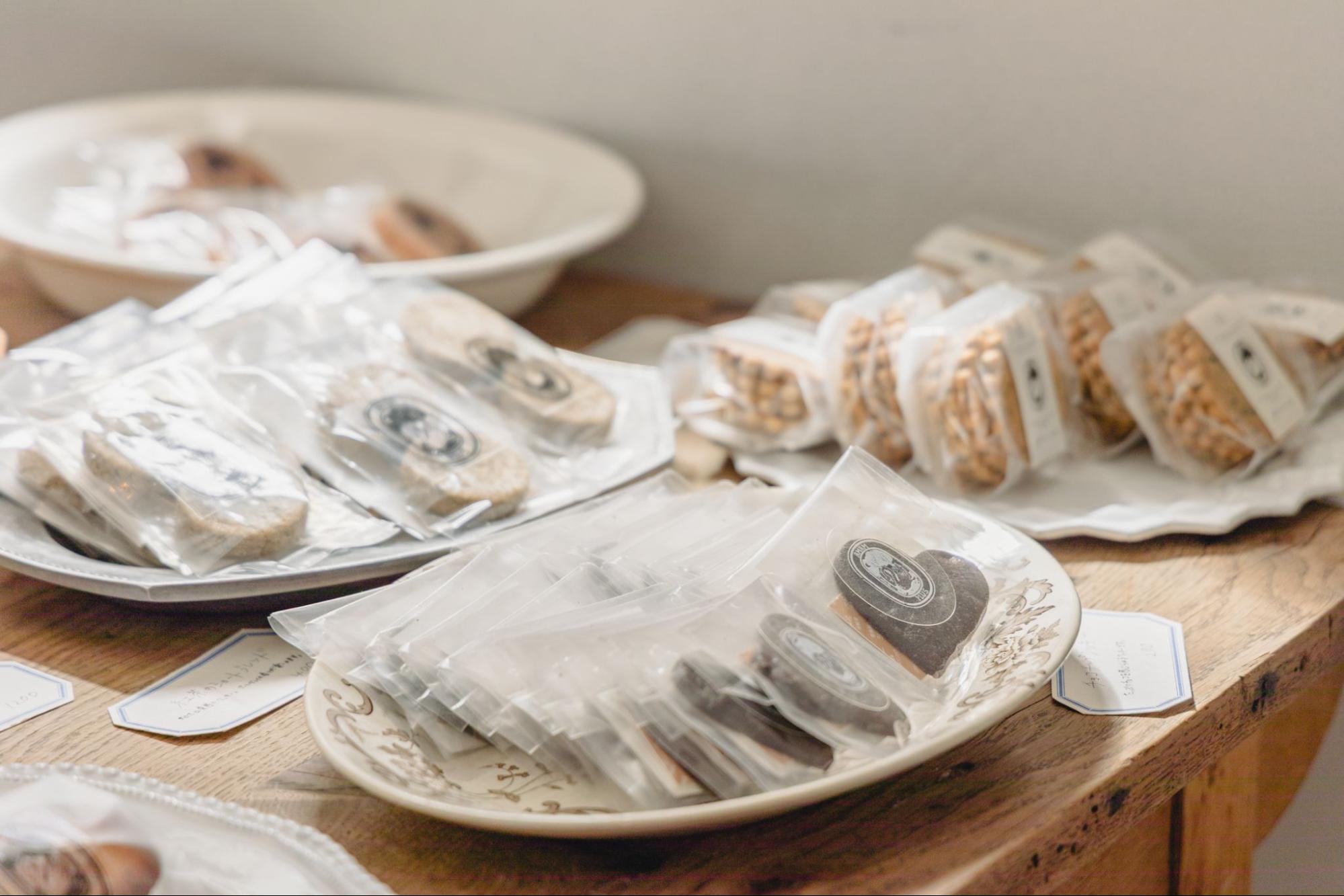 店内にはアンティークの食器やインテリアが並び、長テーブルやカウンターには焼き菓子がずらり。