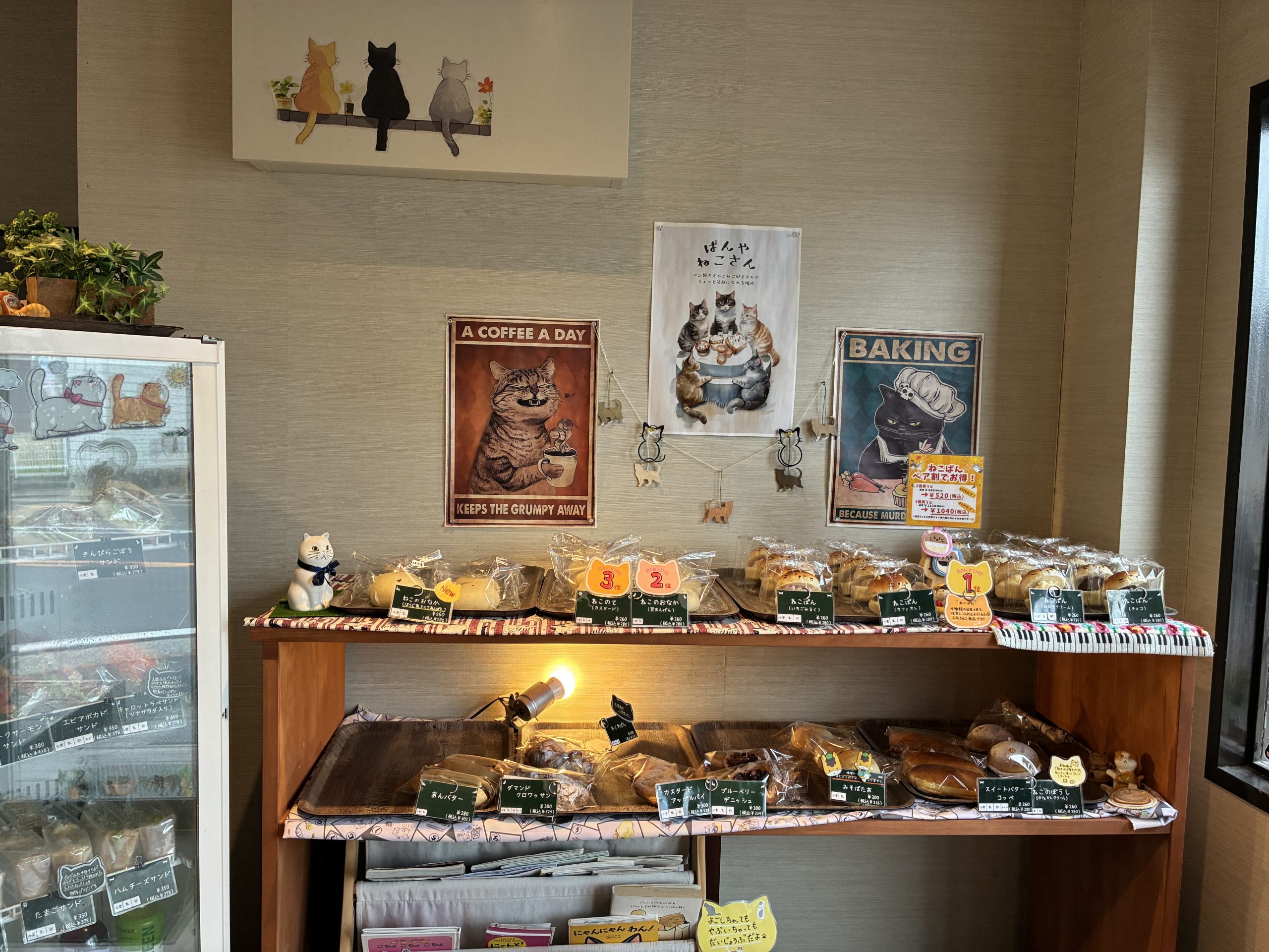 イートインスペースはありませんが、店前のベンチで焼きたてのパンを楽しむのもおすすめです。ねこ好きのご夫婦が営むお店には、ねこをモチーフにしたパンが並び、店内にはお客さんから贈られたものも含め、さまざまなねこのオブジェが飾られています。思わず笑顔になれる、あたたかい雰囲気も魅力。ぜひ足を運んでみてくださいね。