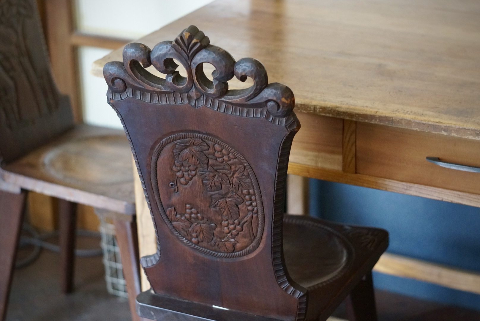 使い込まれた木のテーブルや椅子は、形も色もそれぞれ異なり、ひとつひとつに物語を感じさせるような温かみがあります。